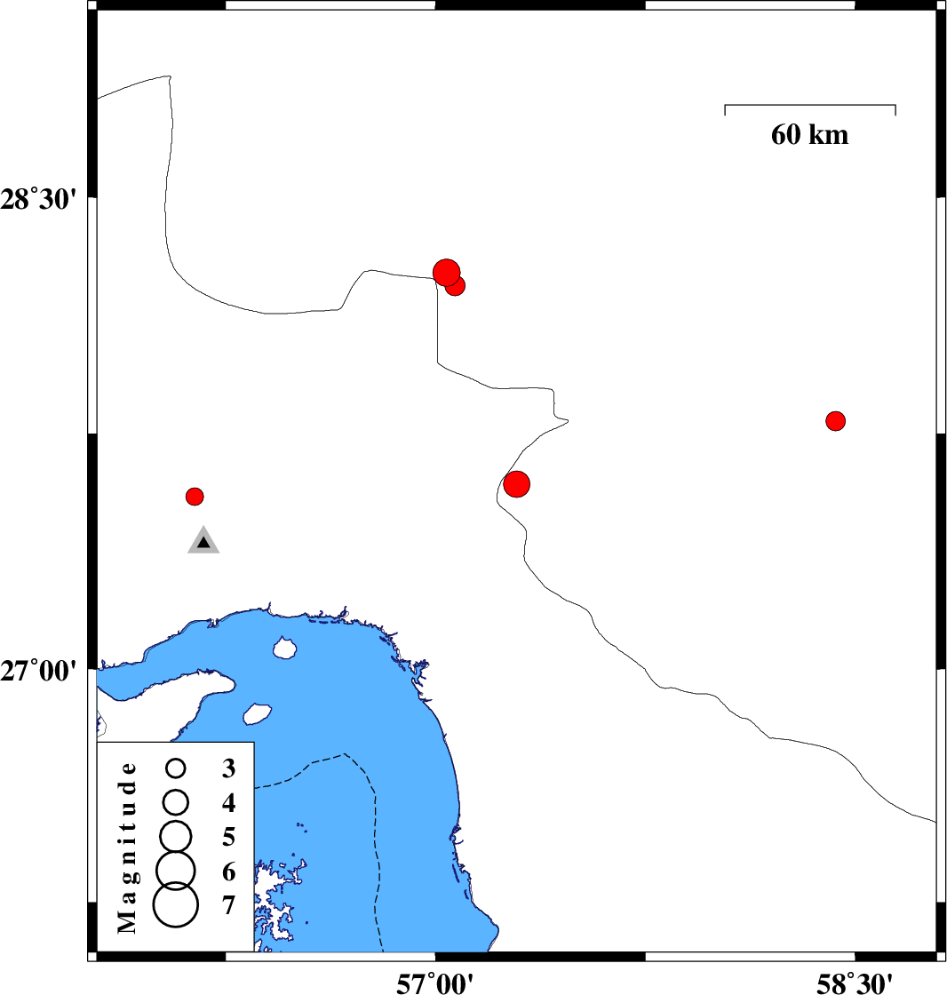 | 2011/11/02 | 10:36:10.3 | 14:06:10.3 | 27.79 | 58.43 | 45 | ML:3.1 | Kerman Province, 74 km South-East of Kahnuj |