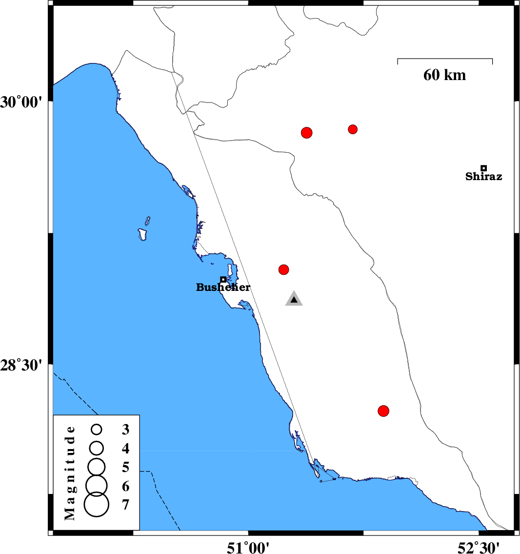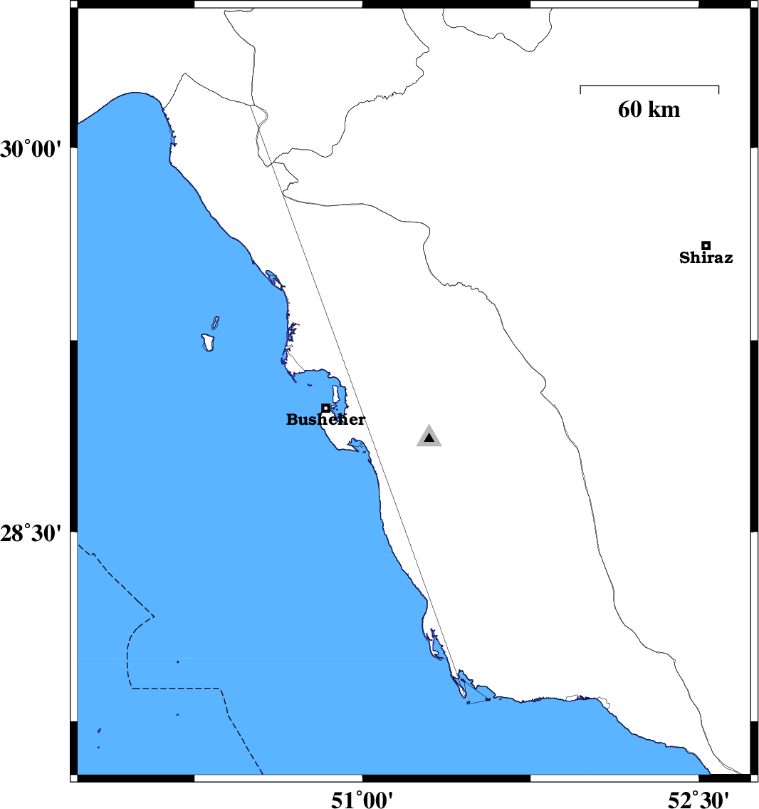 | 2011/11/22 | 05:36:11.6 | 09:06:11.6 | 29.04 | 51.23 | 10 | ML:2.9 | Bushehr Province, 18 km North of Ahram | ||