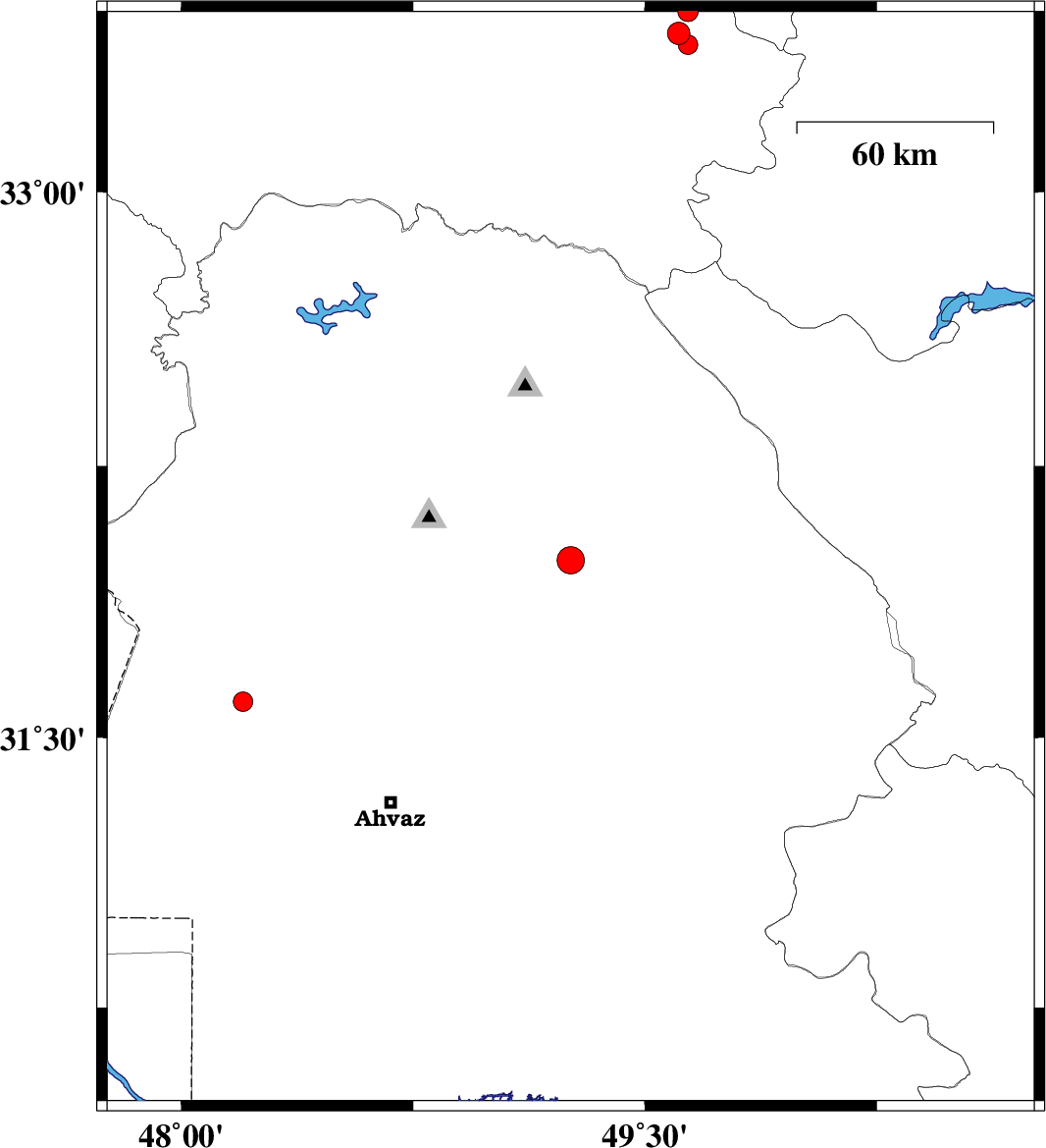 | 2011/11/17 | 00:31:23.2 | 04:01:23.2 | 31.6 | 48.2 | 15 | ML:2.8 | Khoozestan Province, 5 km Susangerd |