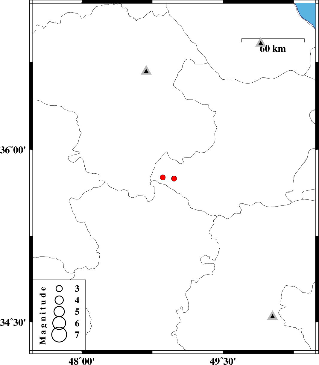 | 2011/11/22 | 01:54:24.6 | 05:24:24.6 | 35.76 | 48.86 | 14 | ML:2.5 | Ghazvin Province, 45 km North-West of Razan |