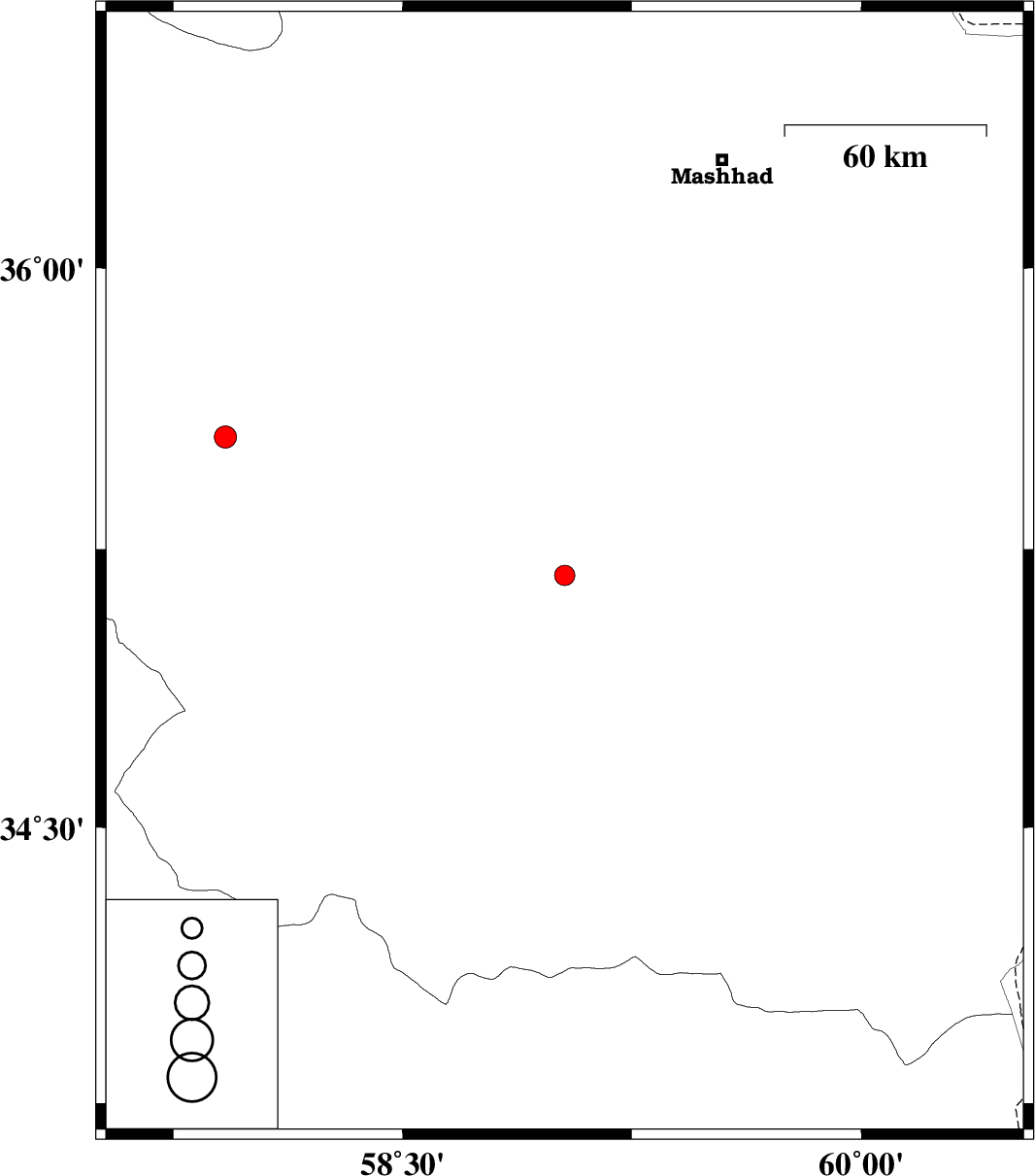 | 2011/11/14 | 06:54:37.0 | 10:24:37.0 | 35.55 | 57.92 | 43 | ML:3.3 | Khorasan(center) Province, 32 km North of Bardeskan |