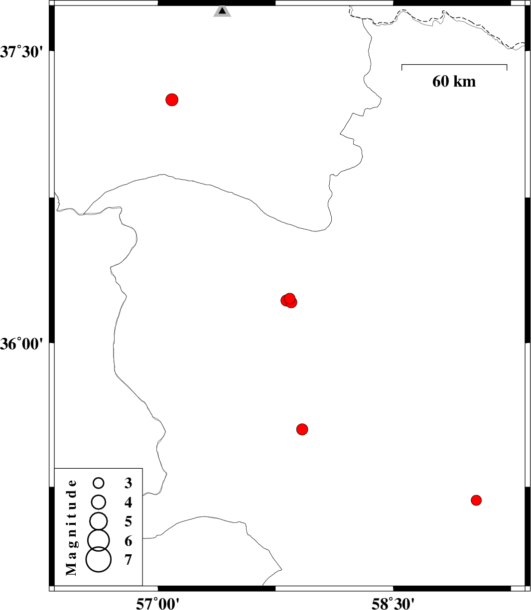 | 2011/11/14 | 06:54:37.0 | 10:24:37.0 | 35.55 | 57.92 | 43 | ML:3.3 | Khorasan(center) Province, 32 km North of Bardeskan | ||