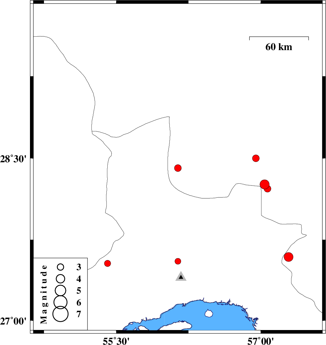 | 2011/11/12 | 13:07:05.2 | 16:37:05.2 | 28.22 | 57.07 | 14 | ML:3.2 | Kerman Province, 68 km North-West of Kahnuj | ||