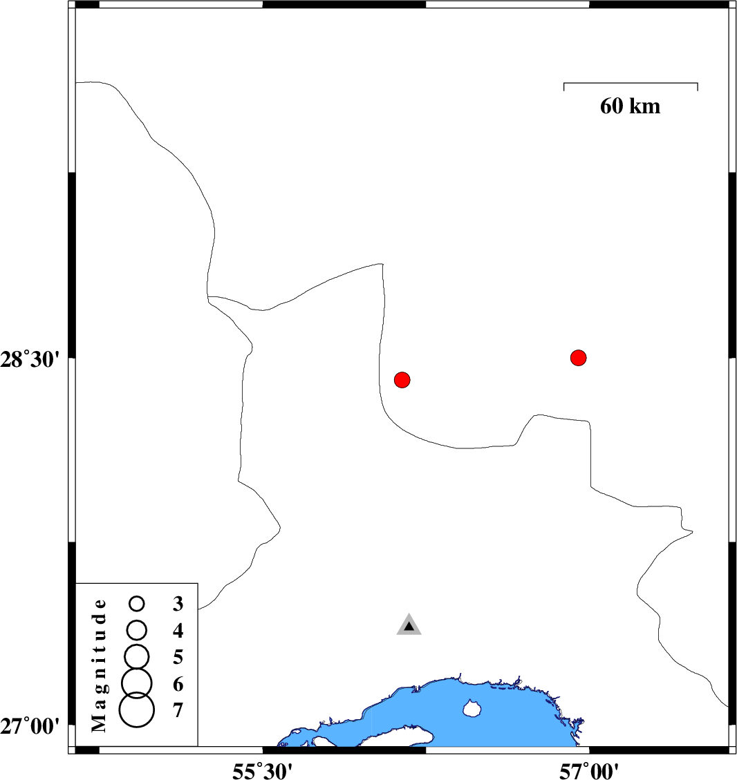 | 2011/12/01 | 03:33:08.6 | 07:03:08.6 | 28.41 | 56.14 | 17 | ML:3.2 | Kerman Province, 26 km North-East of Hajiabad | ||