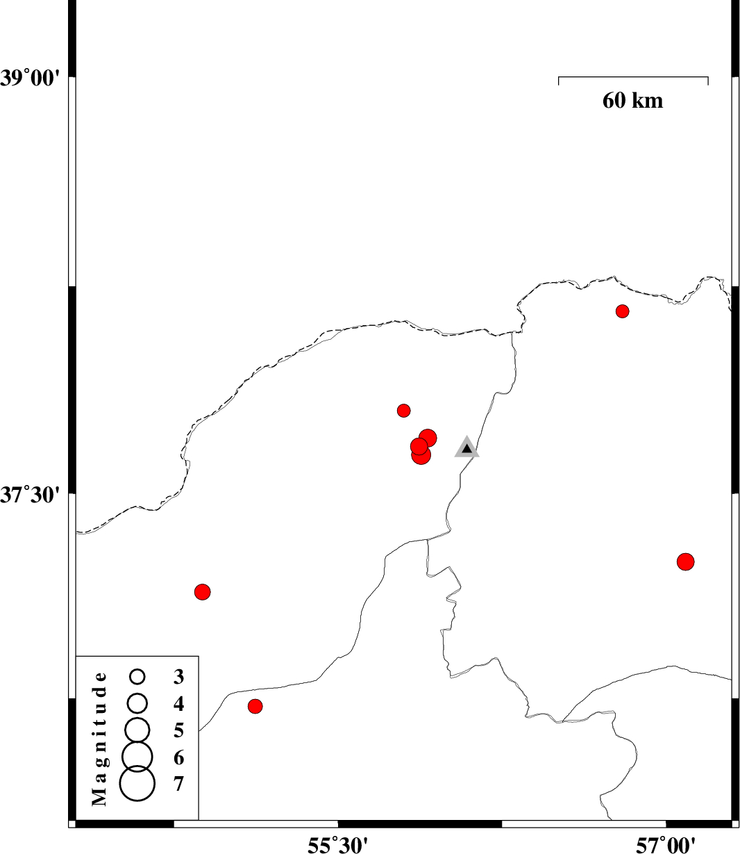 | 2011/12/01 | 03:56:42.1 | 07:26:42.1 | 37.8 | 55.8 | 6 | ML:2.7 | Golestan Province, 54 km North-East of Kalaleh | ||