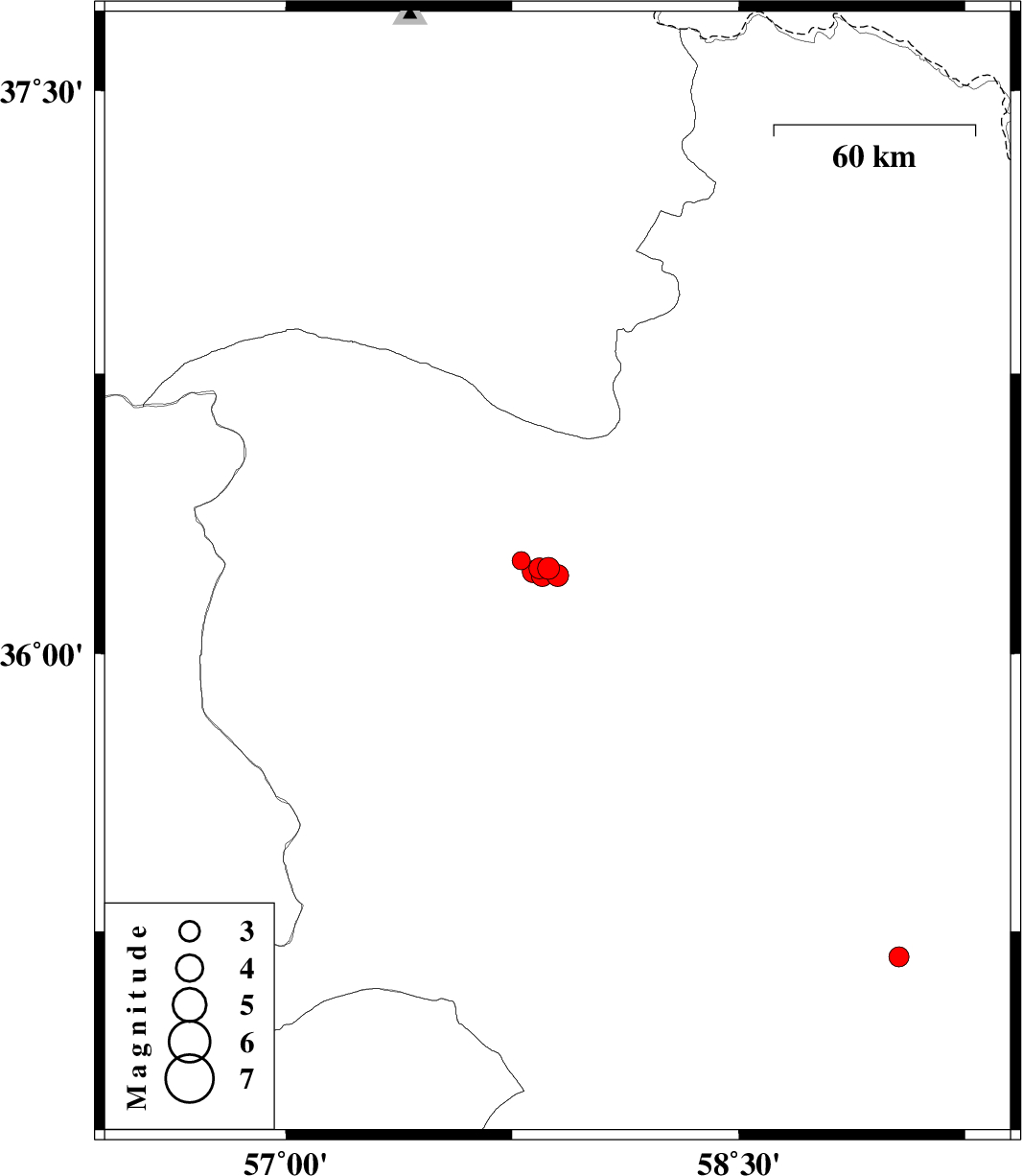 | 2011/11/30 | 23:53:25.4 | 03:23:25.4 | 36.23 | 57.84 | 14 | ML:3.1 | Khorasan(center) Province, 15 km East of Sabzevar | ||