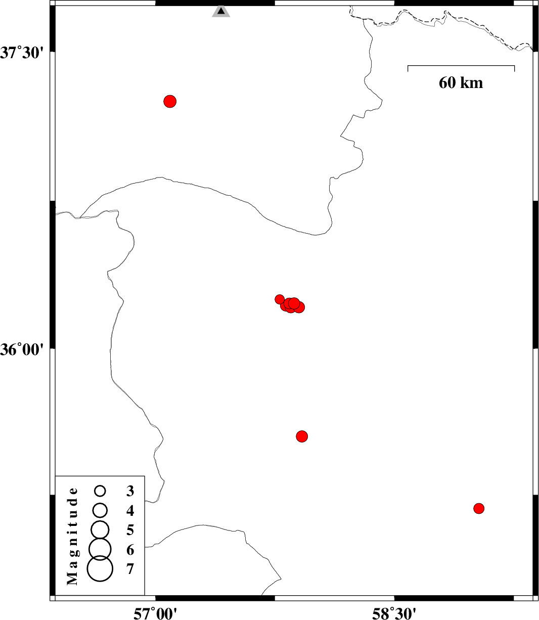 | 2011/11/14 | 06:54:37.0 | 10:24:37.0 | 35.55 | 57.92 | 43 | ML:3.3 | Khorasan(center) Province, 32 km North of Bardeskan | ||