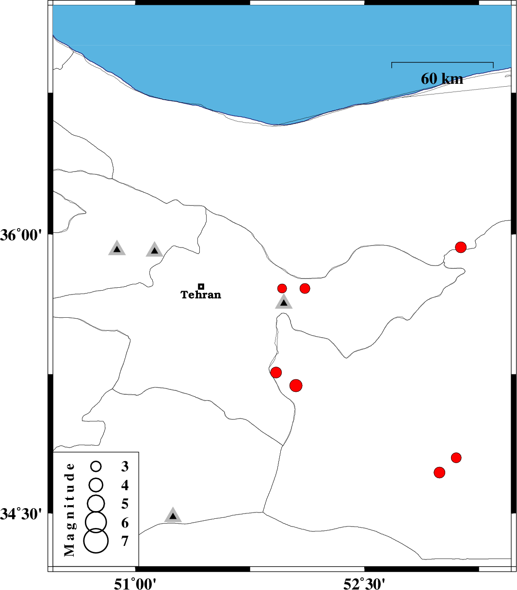 | 2011/12/09 | 01:12:50.1 | 04:42:50.1 | 34.72 | 52.99 | 14 | ML:3.2 | Semnan Province, 82 km South-East of Garmsar | ||