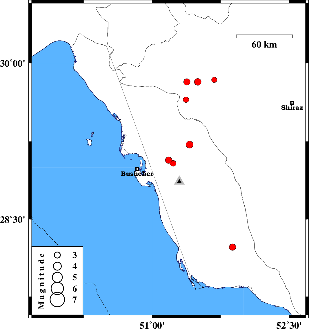 | 2011/12/05 | 06:12:45.0 | 09:42:45.0 | 29.22 | 51.41 | 3 | ML:3.5 | Bushehr Province, 20 km East of Borazjan | ||