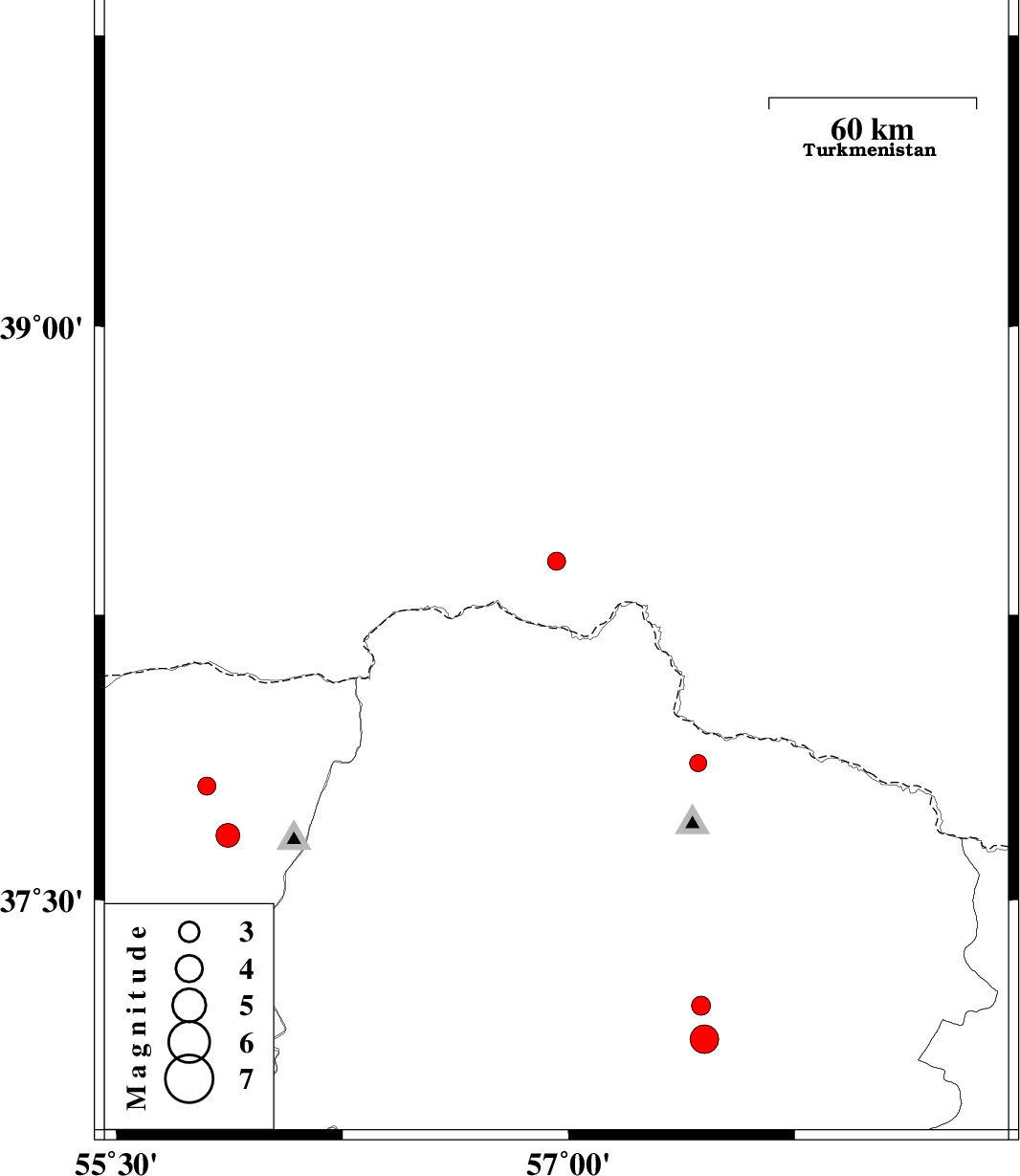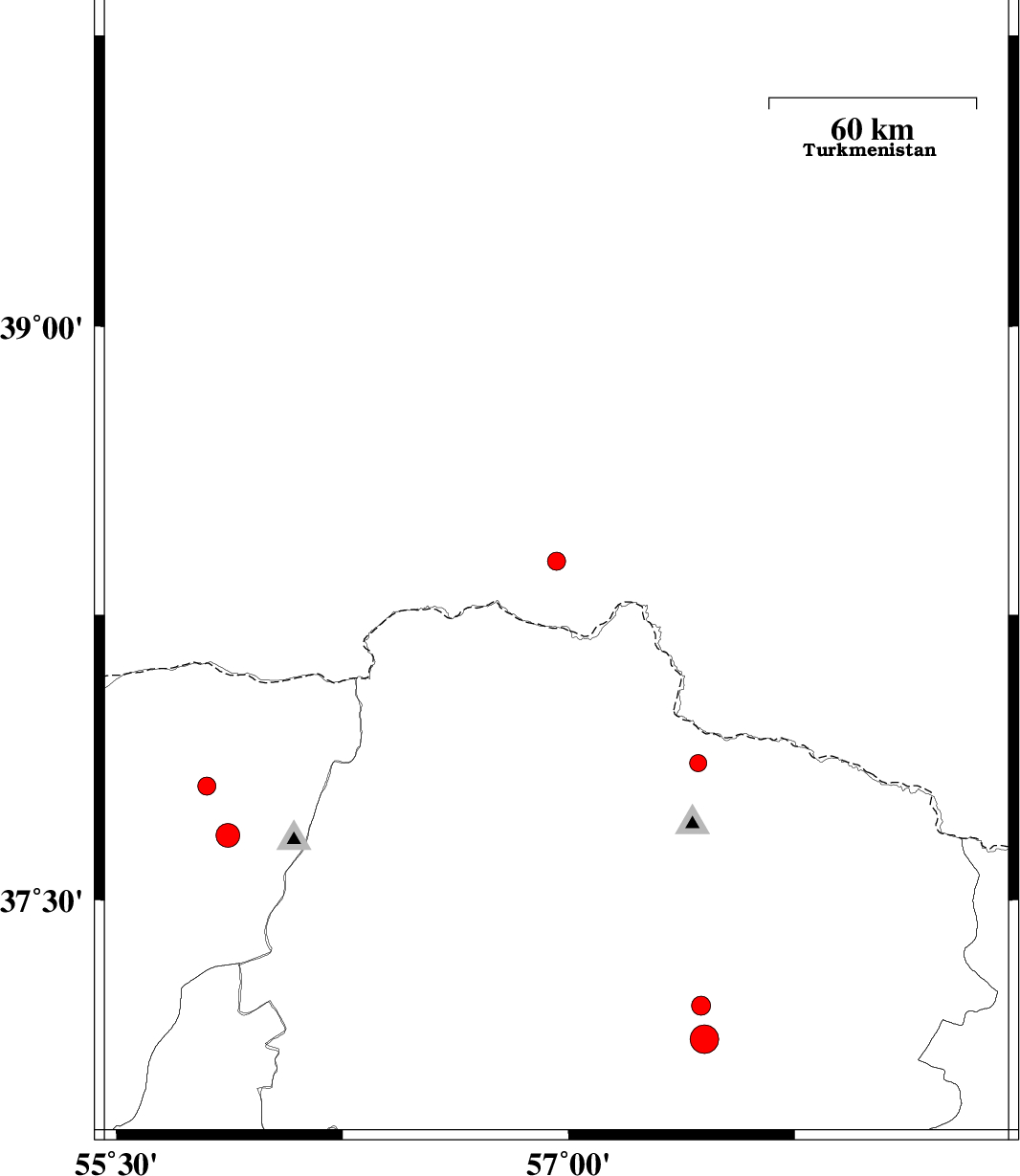 | 2011/12/11 | 04:17:20.9 | 07:47:20.9 | 38.39 | 56.96 | 6 | ML:2.7 | Turkmenistan, 94 km North of Ashkhaneh | ||