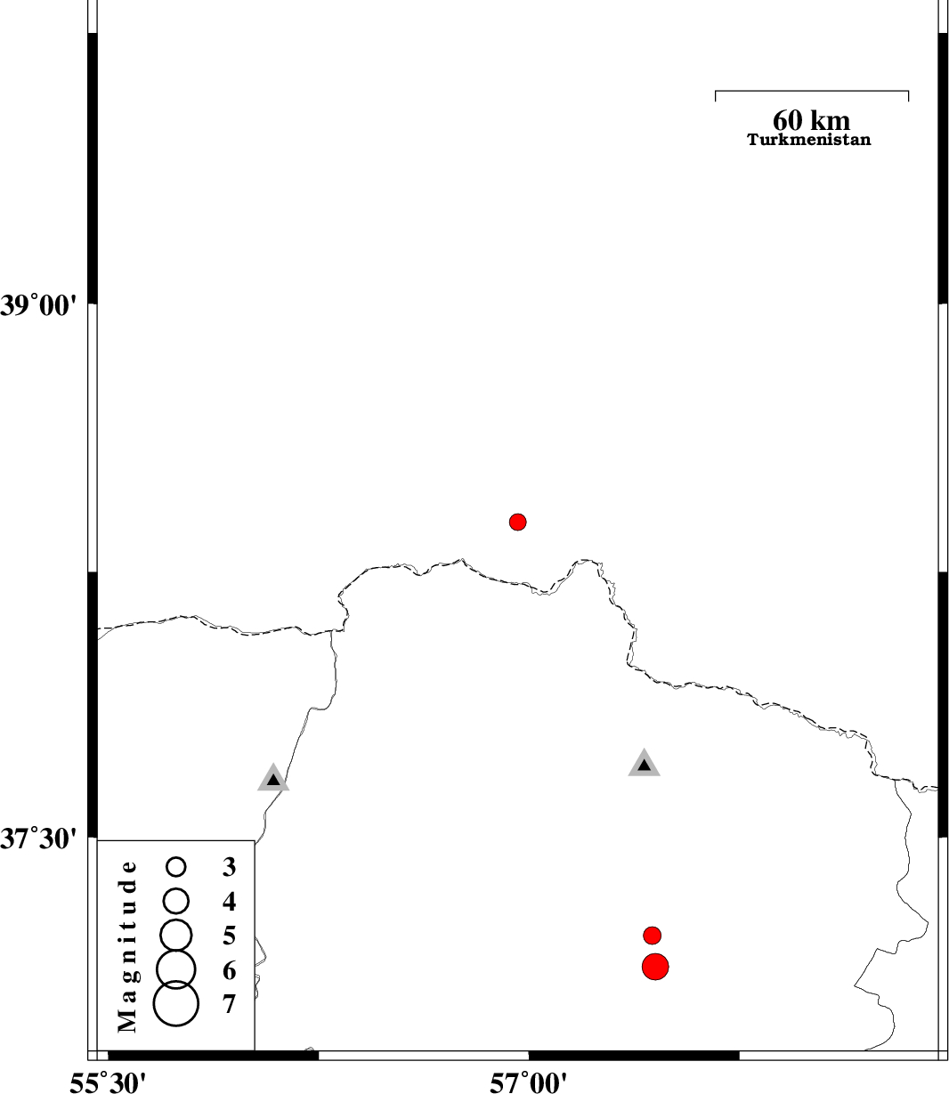 | 2011/12/11 | 04:17:20.9 | 07:47:20.9 | 38.39 | 56.96 | 6 | ML:2.7 | Turkmenistan, 94 km North of Ashkhaneh | ||