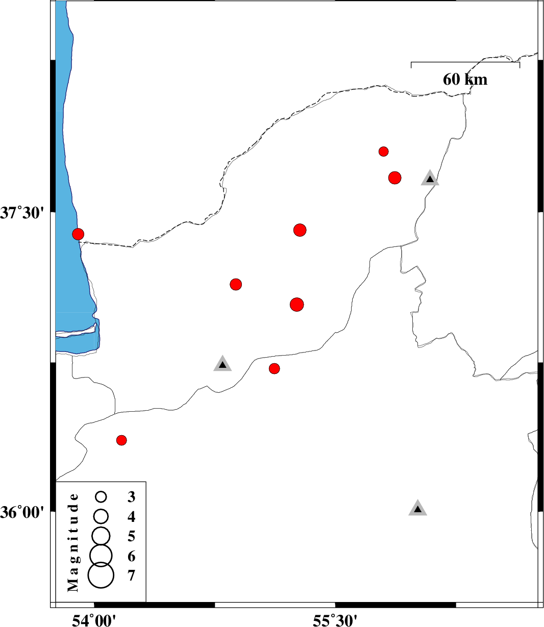 | 2011/12/01 | 03:56:42.1 | 07:26:42.1 | 37.8 | 55.8 | 6 | ML:2.7 | Golestan Province, 54 km North-East of Kalaleh | ||