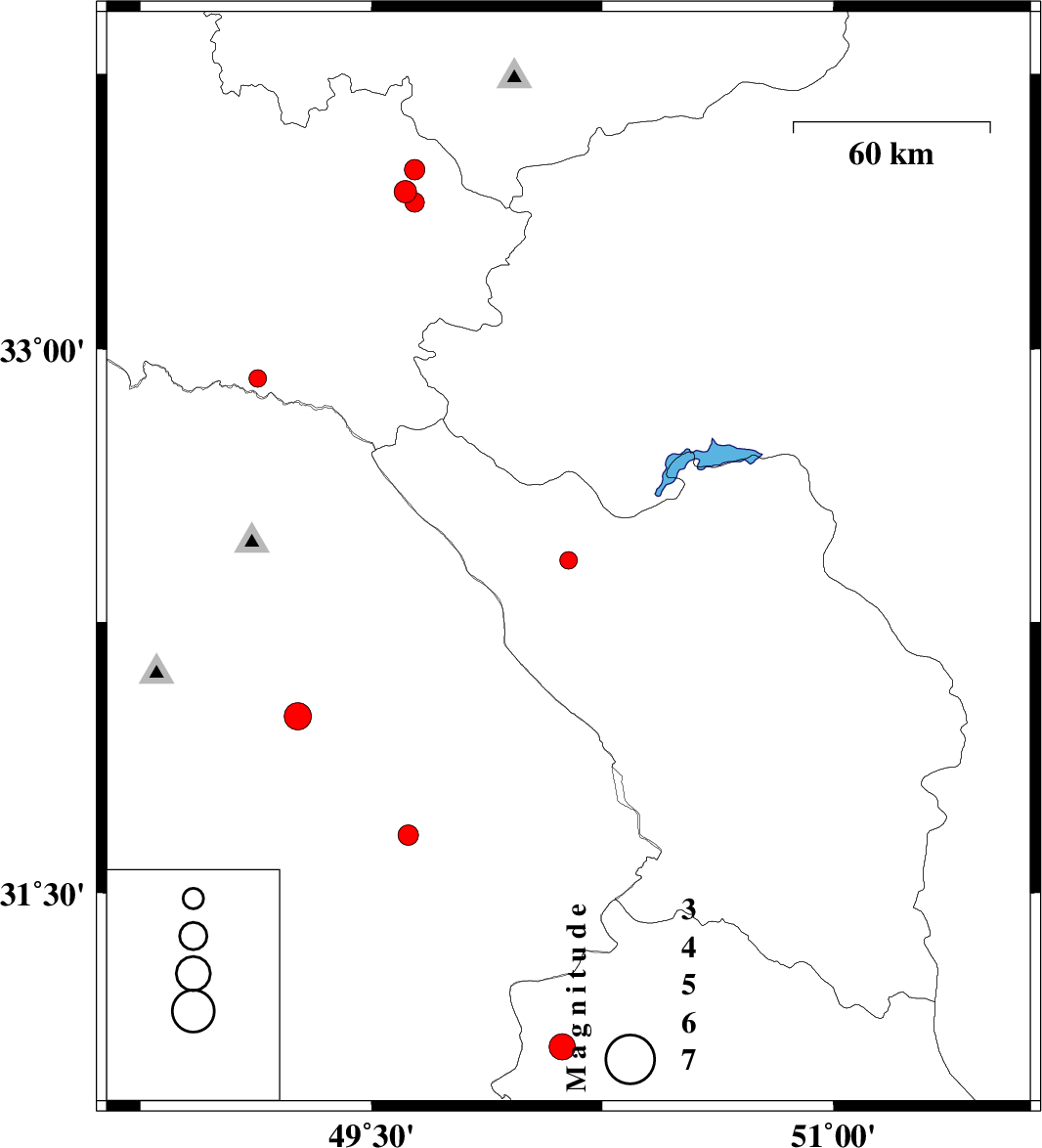 | 2011/11/20 | 04:36:49.4 | 08:06:49.4 | 33.4 | 49.64 | 6 | ML:2.8 | Lorestan Province, 5 km Aligudarz |