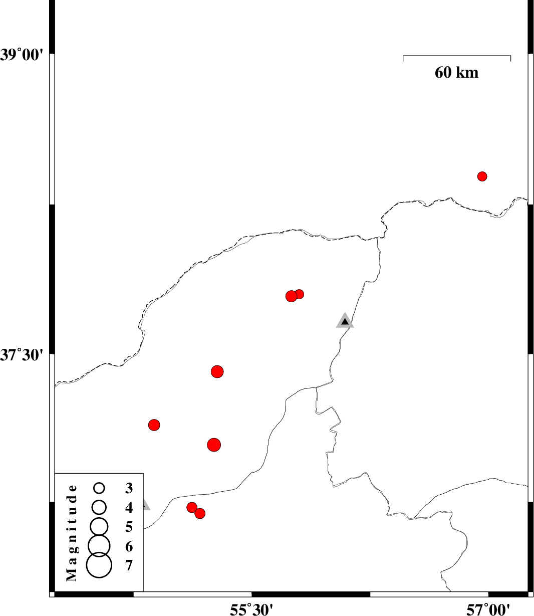 | 2011/12/01 | 03:56:42.1 | 07:26:42.1 | 37.8 | 55.8 | 6 | ML:2.7 | Golestan Province, 54 km North-East of Kalaleh | ||