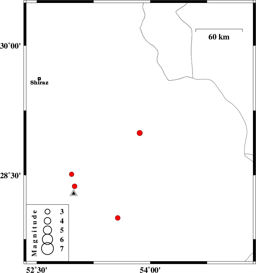 | 2011/12/17 | 08:10:11.7 | 11:40:11.7 | 28.99 | 53.86 | 6 | ML:3.2 | Fars Province, 21 km East of Fasa | ||