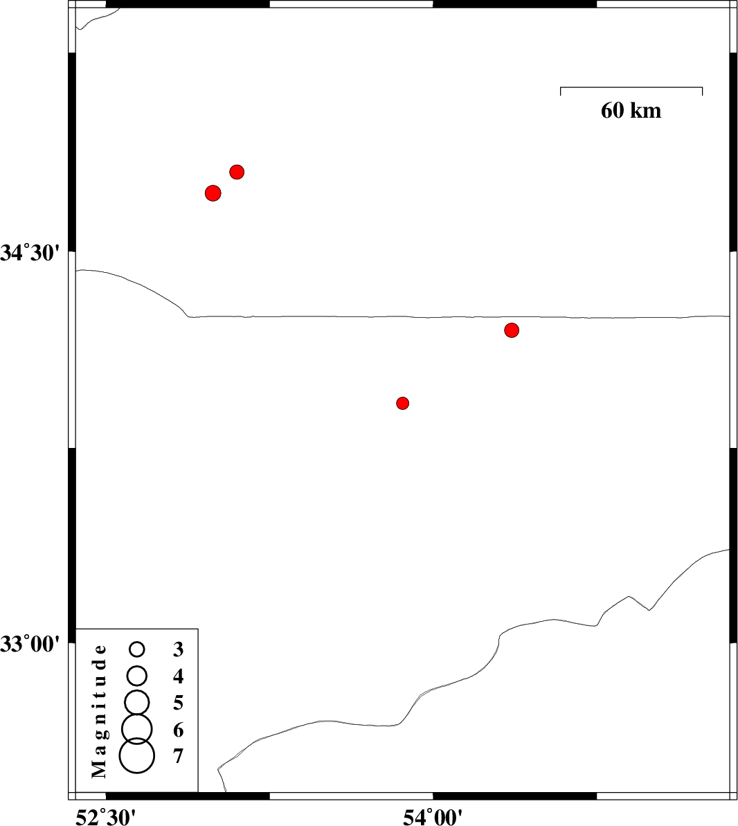 | 2011/12/09 | 01:12:50.1 | 04:42:50.1 | 34.72 | 52.99 | 14 | ML:3.2 | Semnan Province, 82 km South-East of Garmsar | ||