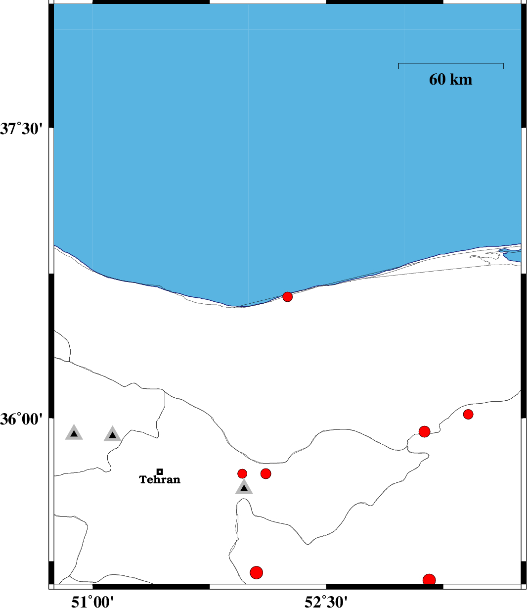 | 2011/12/09 | 18:08:55.8 | 21:38:55.8 | 35.93 | 53.13 | 18 | ML:3.2 | Mazandaran Province, 22 km South of Pol-E-Sefid | ||