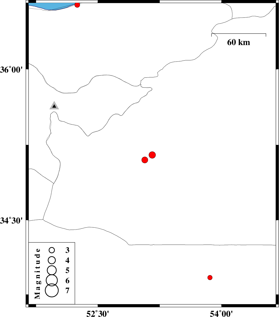 | 2011/12/23 | 22:43:26.8 | 02:13:26.8 | 35.1 | 53.07 | 32 | ML:3.4 | Semnan Province, 60 km South-West of Semnan | ||