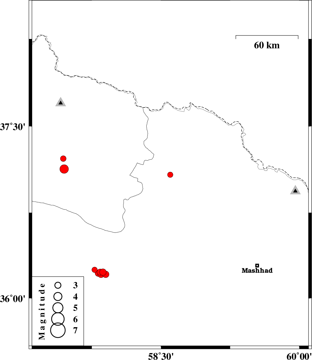 | 2011/12/24 | 22:56:20.4 | 02:26:20.4 | 37.08 | 58.6 | 6 | ML:2.7 | Khorasan(center) Province, 9 km Quchan | ||