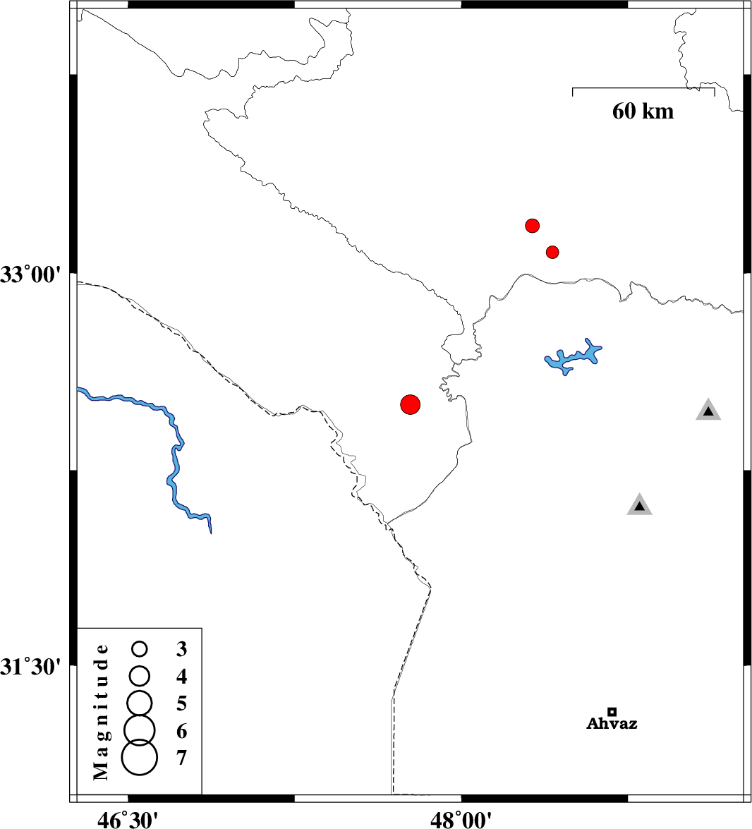 | 2011/12/21 | 21:27:57.0 | 00:57:57.0 | 33.18 | 48.32 | 14 | ML:2.8 | Lorestan Province, 34 km South of Khorramabad |