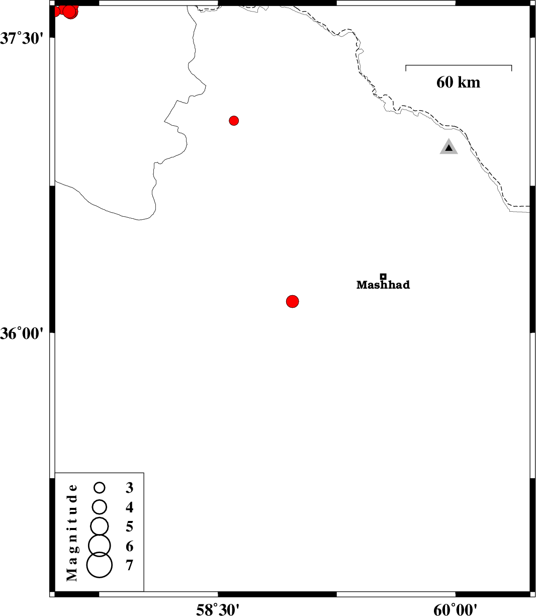 | 2011/12/24 | 22:56:20.4 | 02:26:20.4 | 37.08 | 58.6 | 6 | ML:2.7 | Khorasan(center) Province, 9 km Quchan |