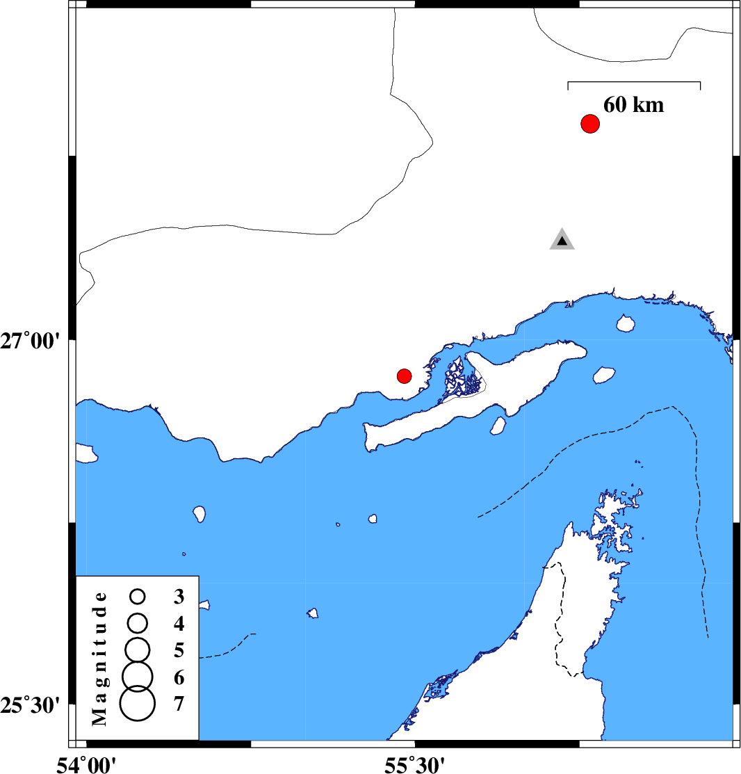 | 2011/12/28 | 19:15:27.0 | 22:45:27.0 | 26.85 | 55.45 | 17 | ML:3 | Hormozgan Province, 81 km South-West of Qeshm | ||