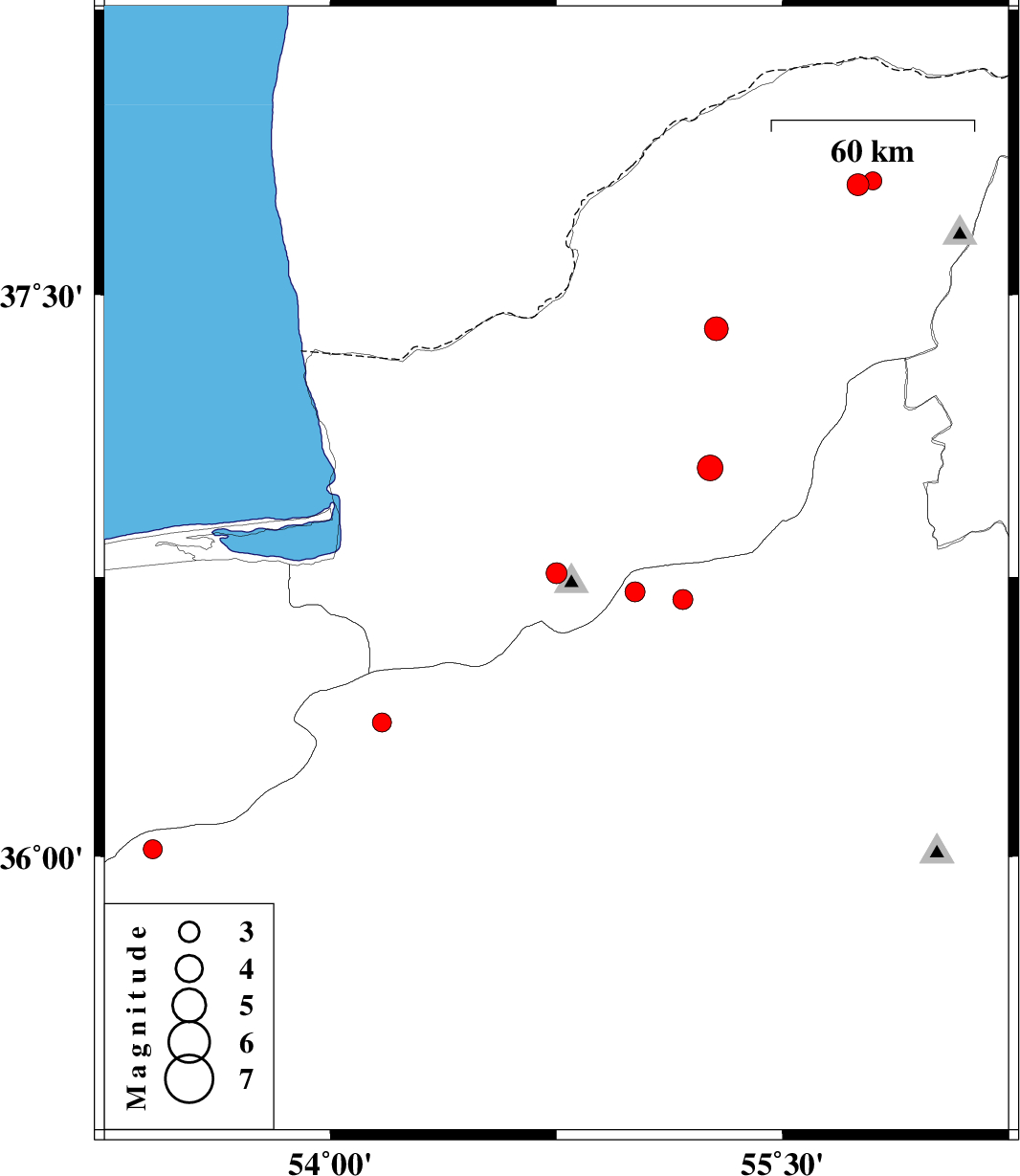 | 2011/12/01 | 03:56:42.1 | 07:26:42.1 | 37.8 | 55.8 | 6 | ML:2.7 | Golestan Province, 54 km North-East of Kalaleh |