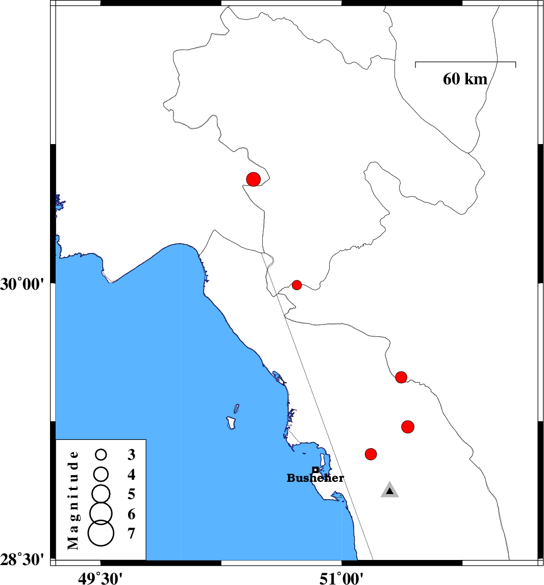 | 2011/12/05 | 06:12:45.0 | 09:42:45.0 | 29.22 | 51.41 | 3 | ML:3.5 | Bushehr Province, 20 km East of Borazjan |