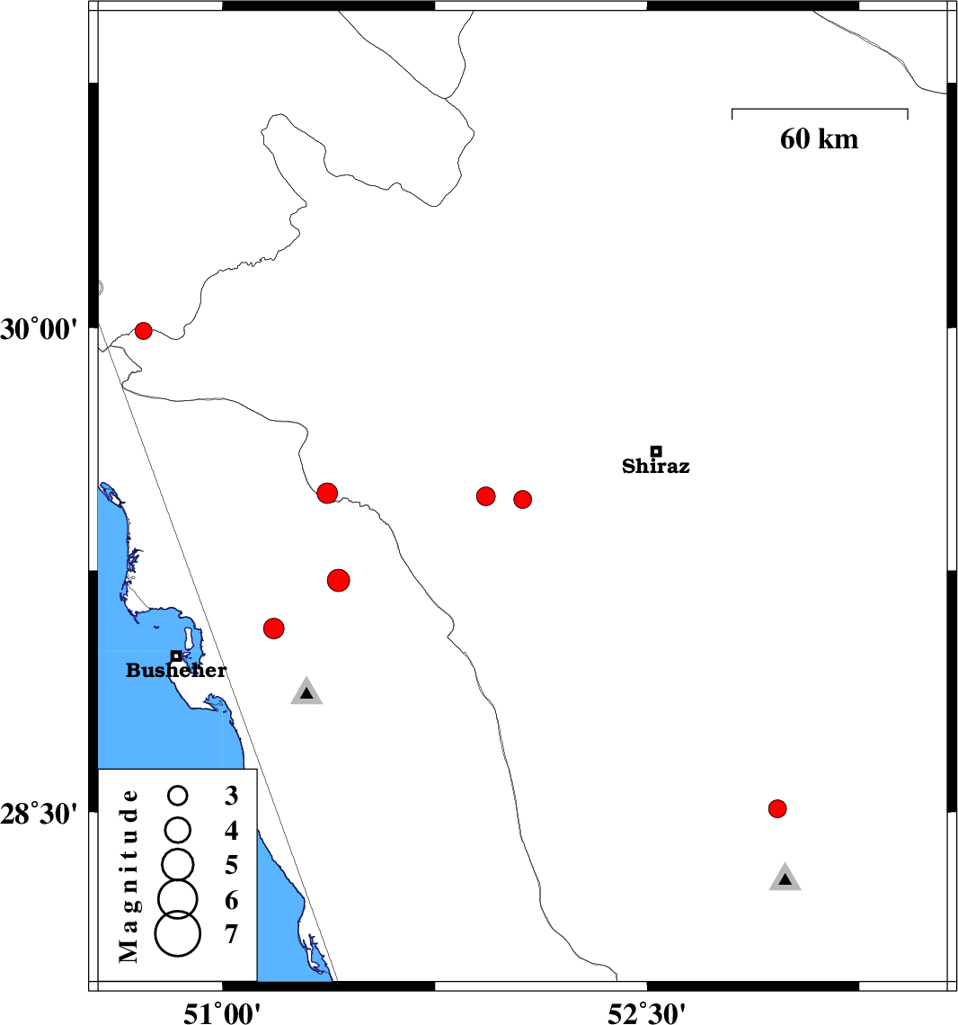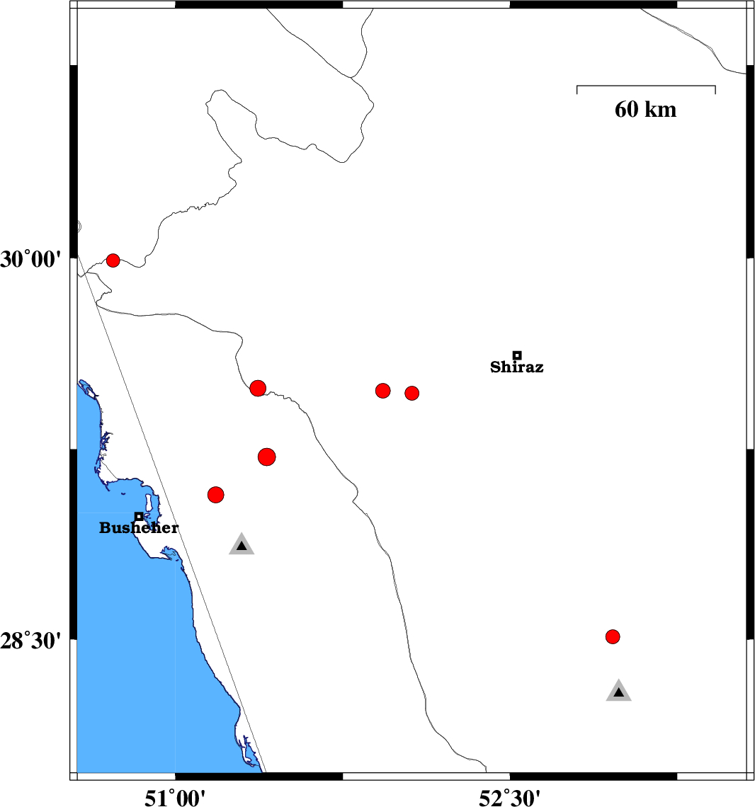 | 2011/12/05 | 06:12:45.0 | 09:42:45.0 | 29.22 | 51.41 | 3 | ML:3.5 | Bushehr Province, 20 km East of Borazjan |