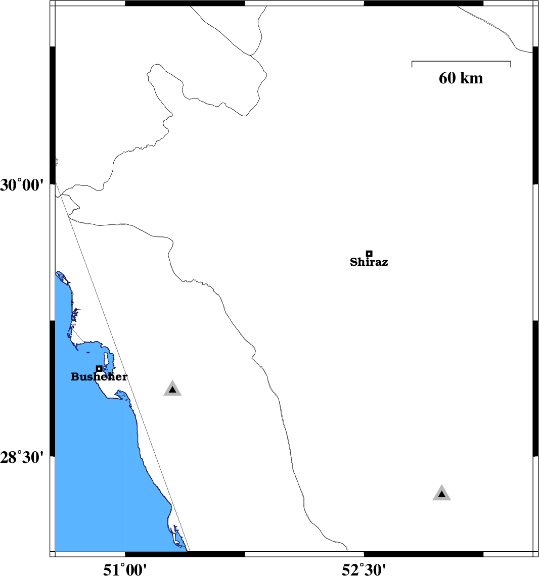 | 2011/12/25 | 08:56:46.1 | 12:26:46.1 | 29.49 | 51.37 | 35 | ML:3.3 | Fars Province, 30 km North-East of Borazjan | ||