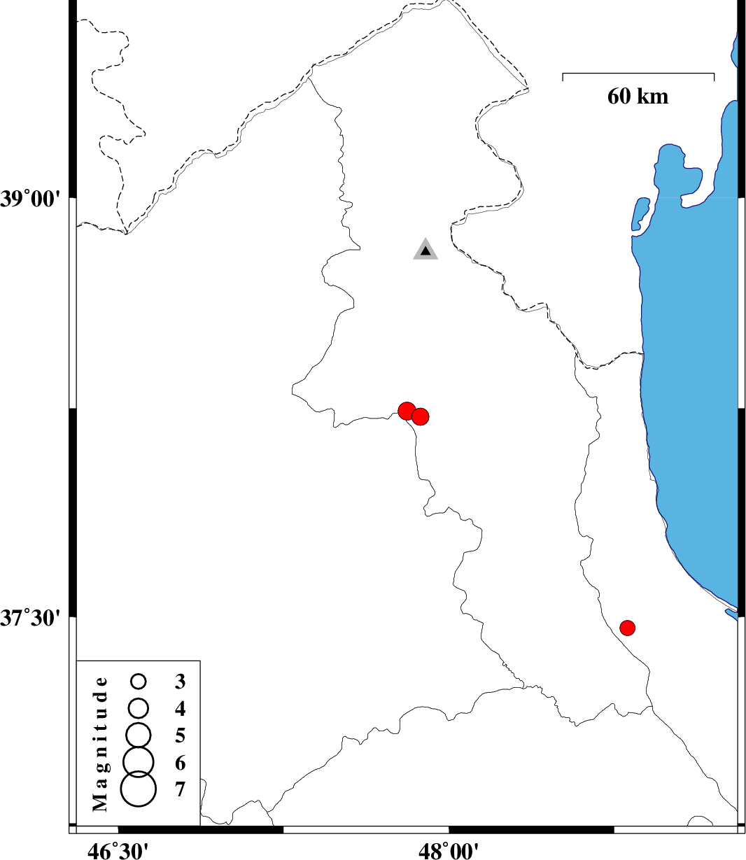 | 2012/01/03 | 00:56:30.8 | 04:26:30.8 | 38.24 | 47.81 | 14 | ML:3.6 | Ardebil Province, 22 km South-East of Meshgin Shahr | ||