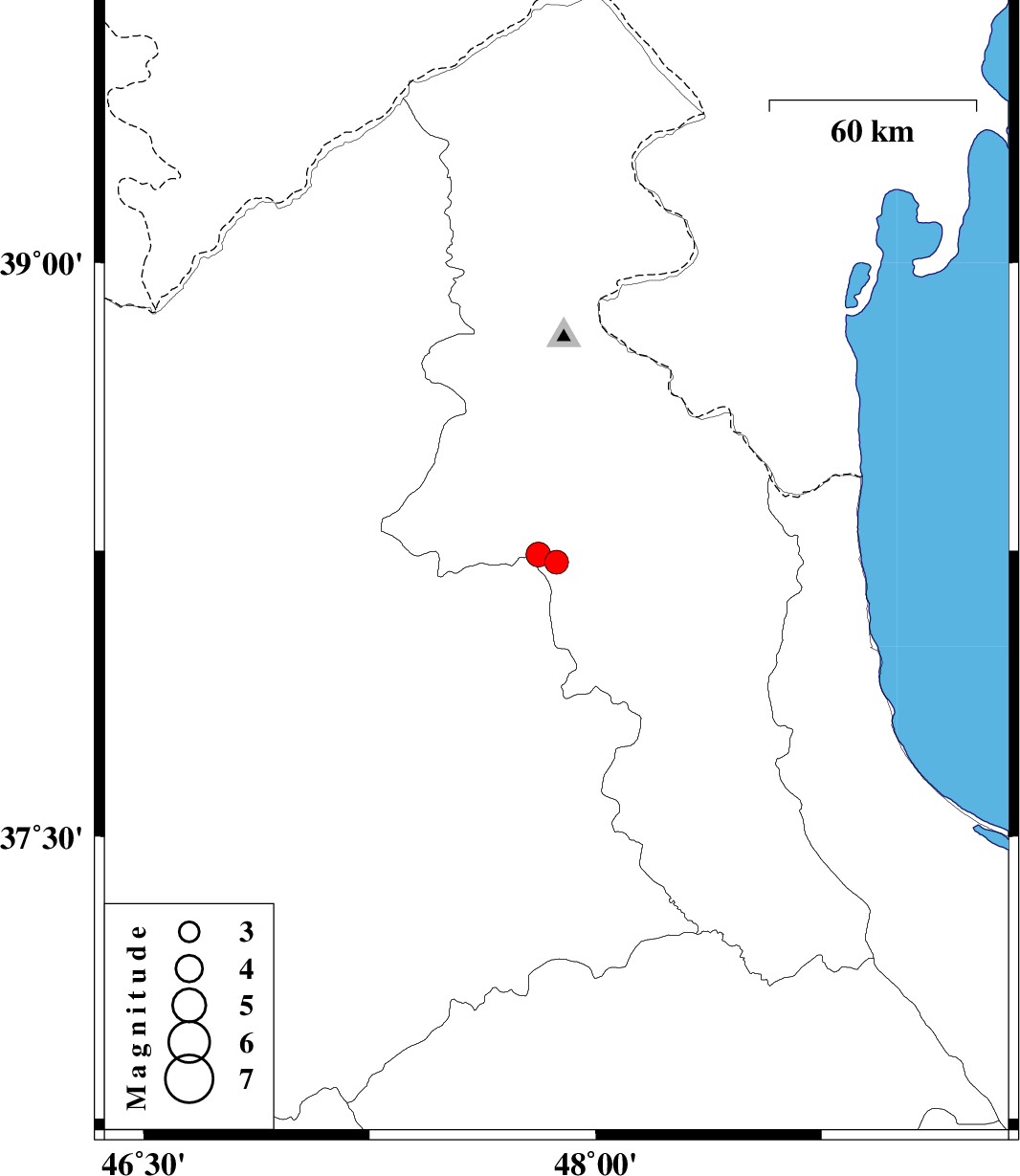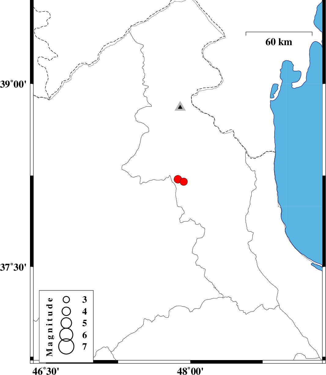 | 2012/01/03 | 00:56:30.8 | 04:26:30.8 | 38.24 | 47.81 | 14 | ML:3.6 | Ardebil Province, 22 km South-East of Meshgin Shahr |