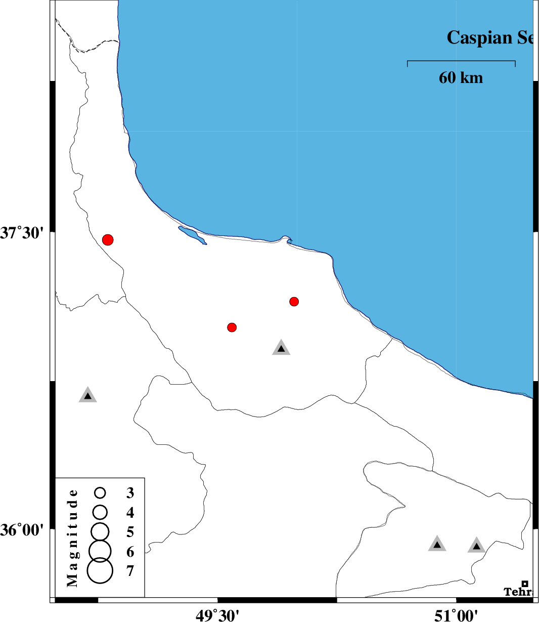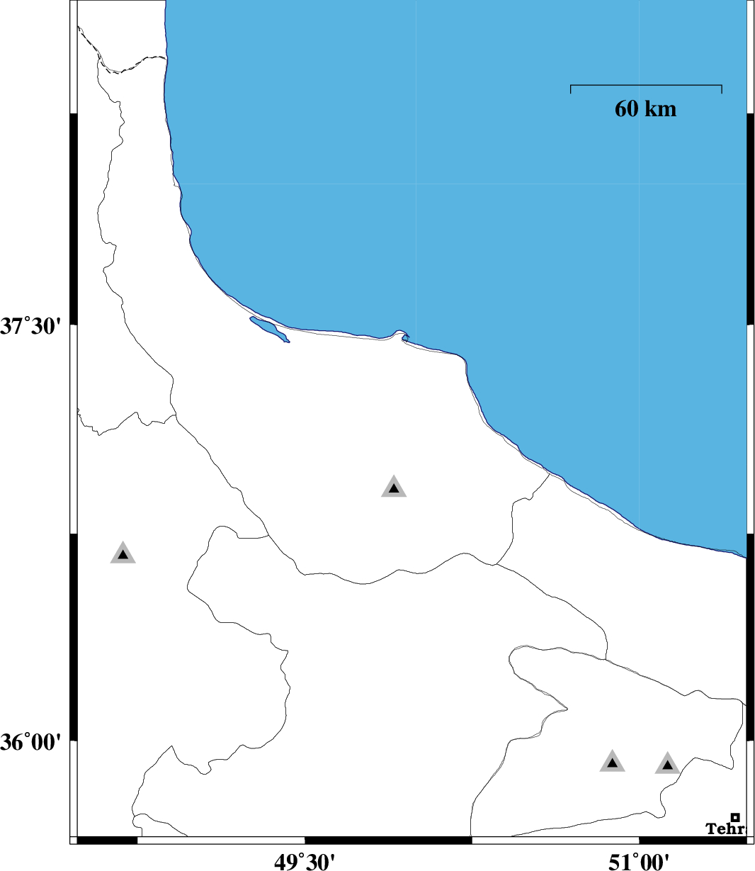 | 2011/12/30 | 00:25:14.8 | 03:55:14.8 | 37.02 | 49.59 | 15 | ML:2.5 | Gilan Province, 29 km South of Rasht | ||