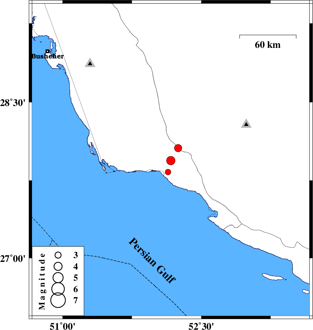 | 2012/01/05 | 21:42:01.2 | 01:12:01.2 | 27.83 | 52.14 | 40 | ML:2.8 | Bushehr Province, 7 km Bandar-e kangan | ||
