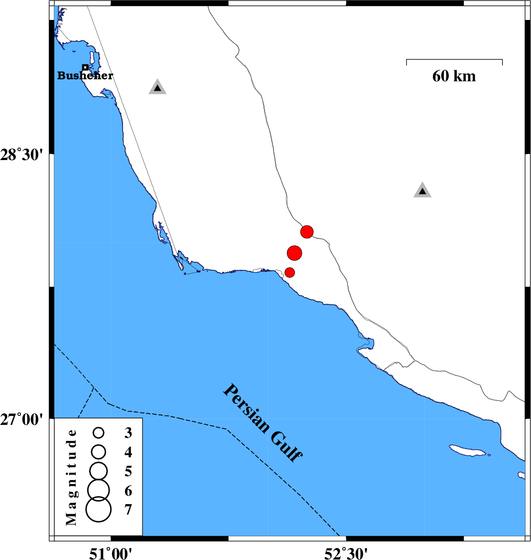 | 2012/01/05 | 21:42:01.2 | 01:12:01.2 | 27.83 | 52.14 | 40 | ML:2.8 | Bushehr Province, 7 km Bandar-e kangan | ||