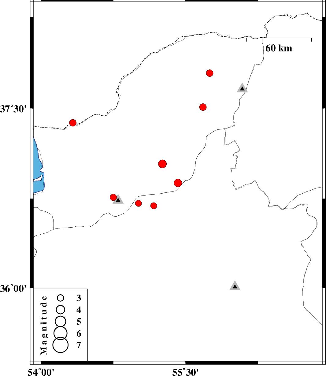 | 2012/01/03 | 16:47:33.3 | 20:17:33.3 | 37.51 | 55.68 | 15 | ML:3.3 | Golestan Province, 22 km North-East of Kalaleh | ||