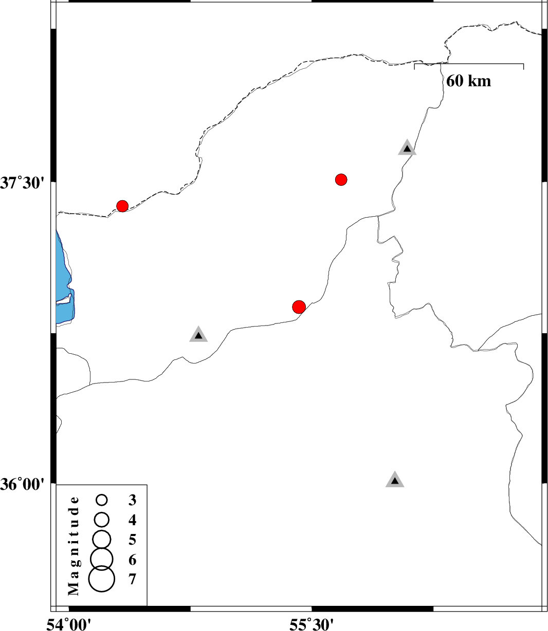 | 2012/01/07 | 15:12:23.2 | 18:42:23.2 | 36.88 | 55.42 | 14 | ML:3.6 | Golestan Province, 39 km South of Minodasht | ||