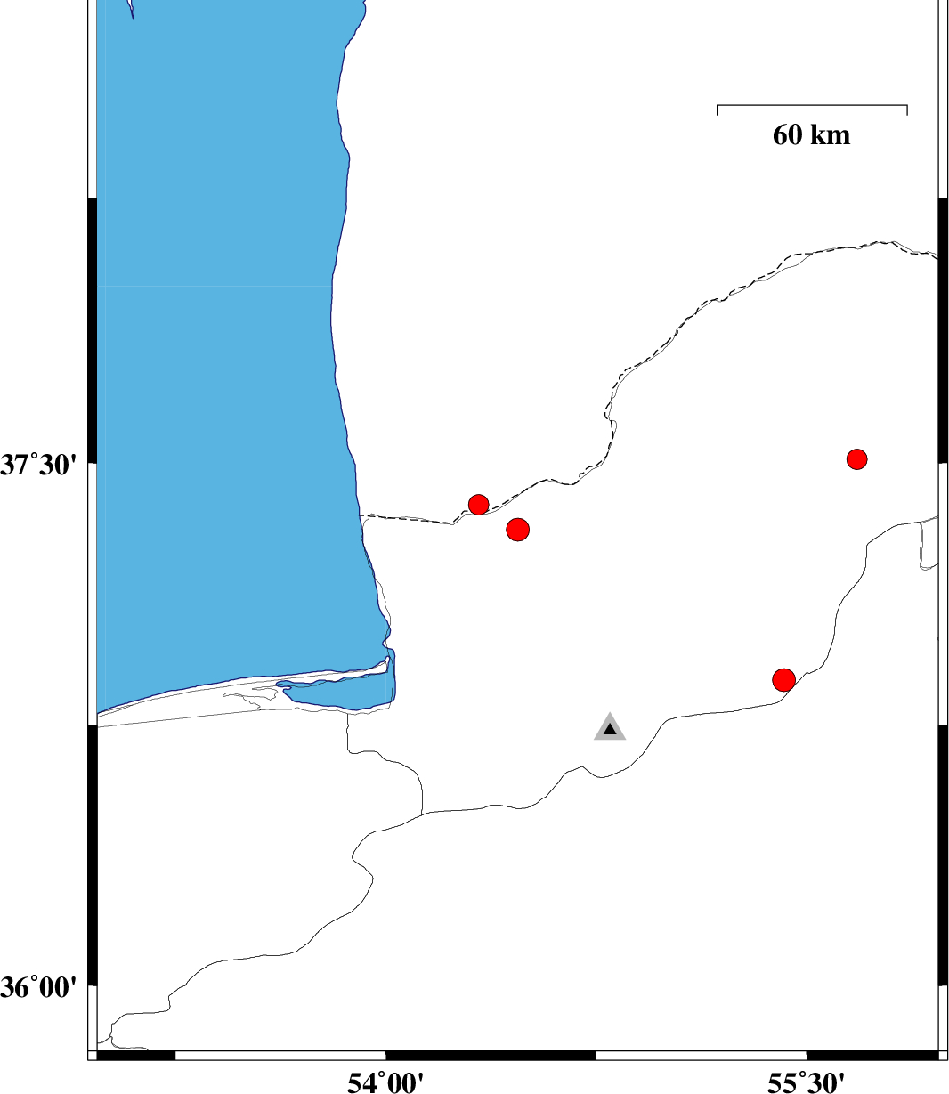 | 2012/01/10 | 16:14:01.7 | 19:44:01.7 | 37.31 | 54.47 | 14 | ML:3.6 | Golestan Province, 33 km North of Aq Qaleh | ||