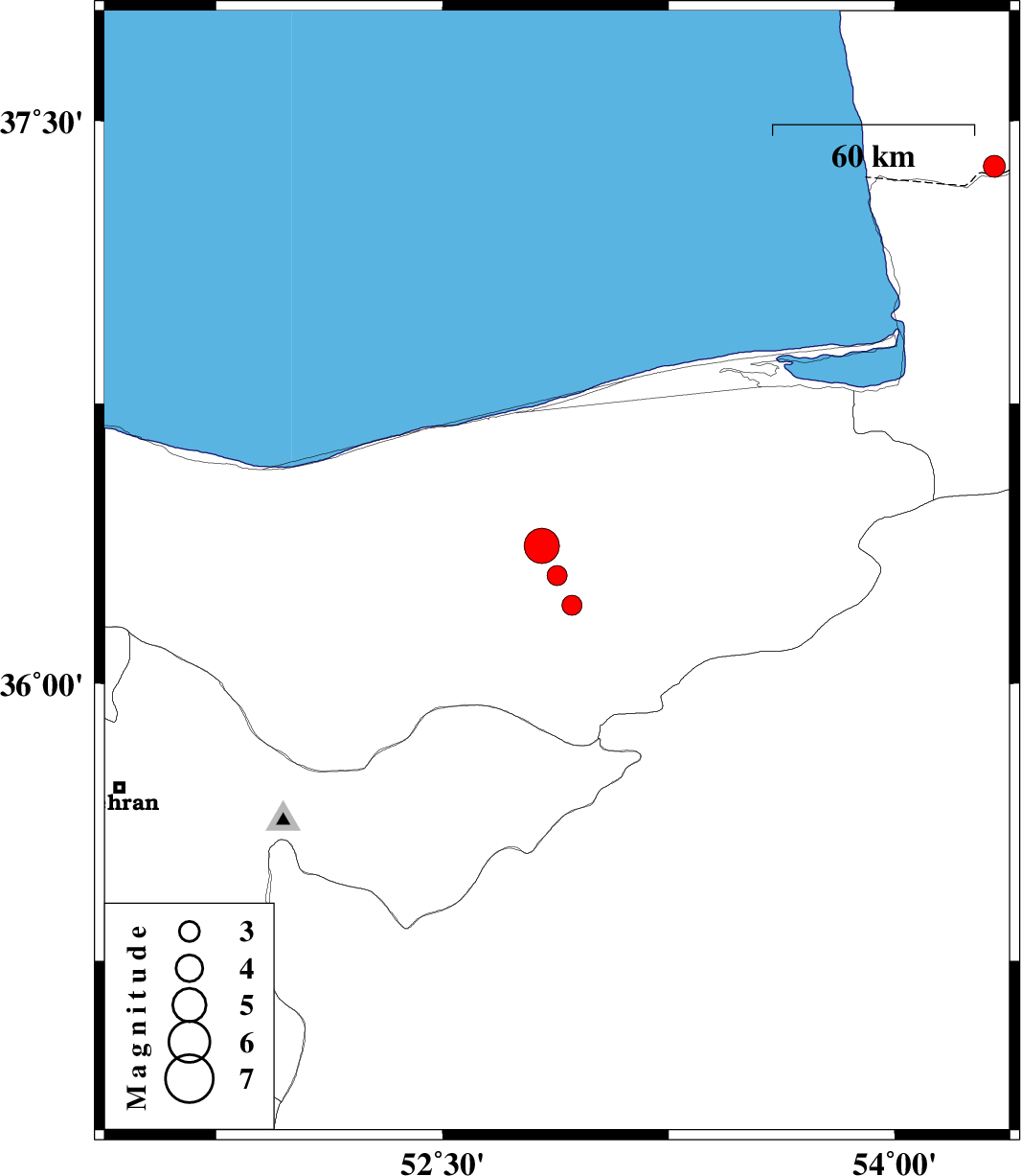 | 2012/01/11 | 19:03:20.3 | 22:33:20.3 | 36.21 | 52.93 | 18 | ML:2.9 | Mazandaran Province, 15 km West of Pol-E-Sefid | ||
