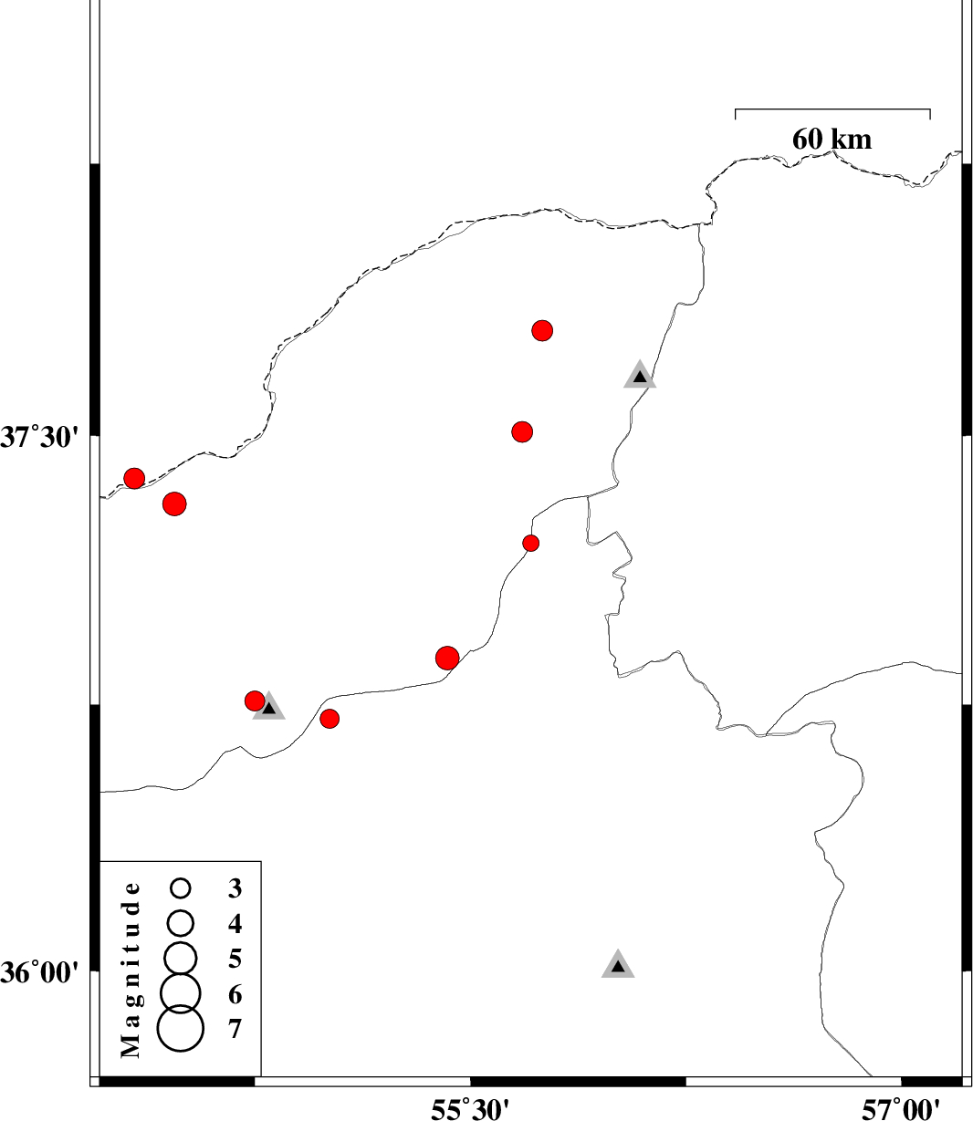 | 2012/01/10 | 16:14:01.7 | 19:44:01.7 | 37.31 | 54.47 | 14 | ML:3.6 | Golestan Province, 33 km North of Aq Qaleh | ||