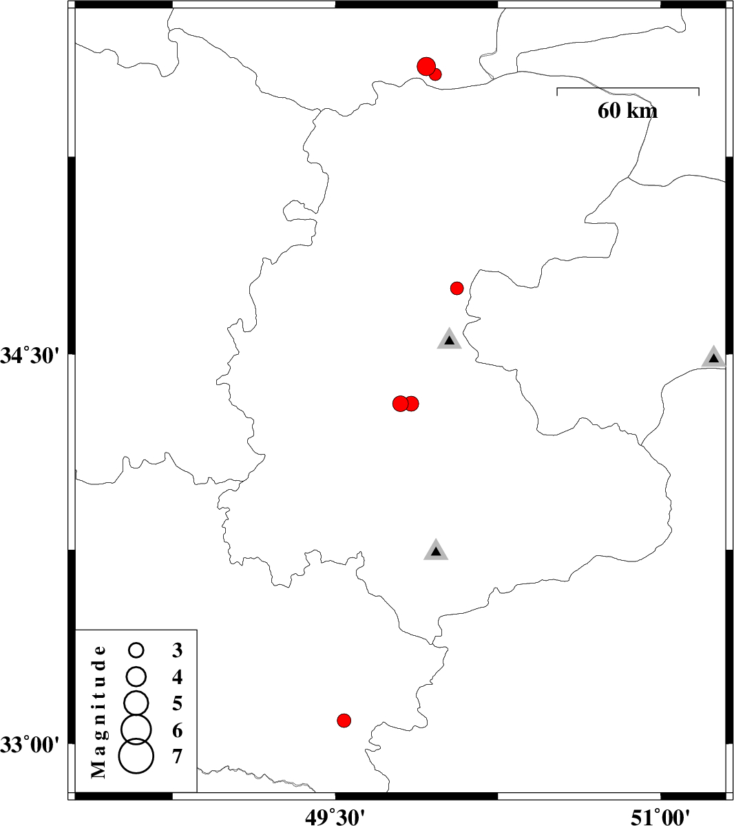 | 2012/01/14 | 09:45:11.9 | 13:15:11.9 | 33.09 | 49.54 | 15 | ML:2.8 | Lorestan Province, 41 km South of Azna | ||