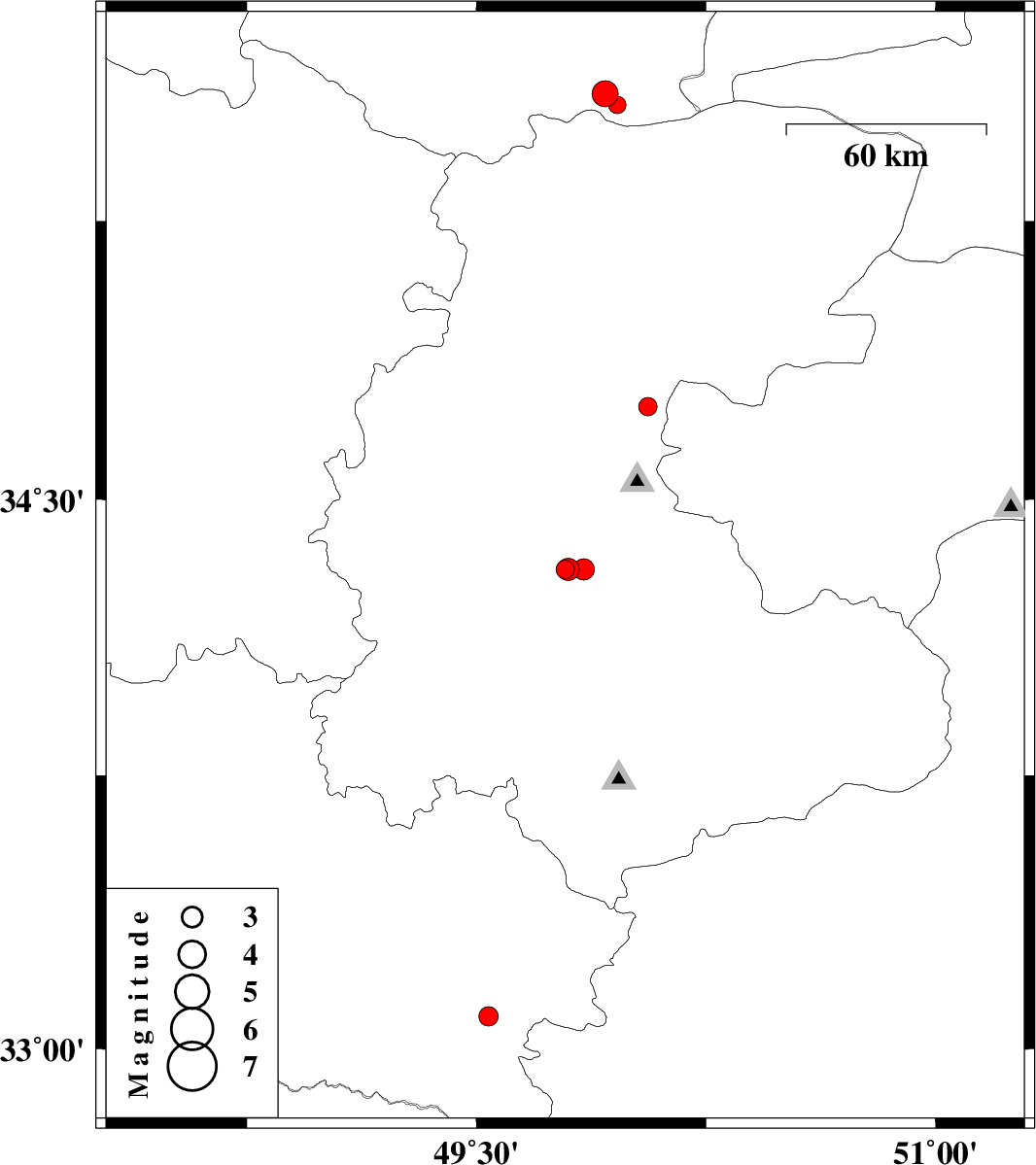 | 2012/01/15 | 05:59:20.1 | 09:29:20.1 | 34.31 | 49.79 | 14 | ML:2.7 | Markazi Province, 27 km North-East of Arak | ||
