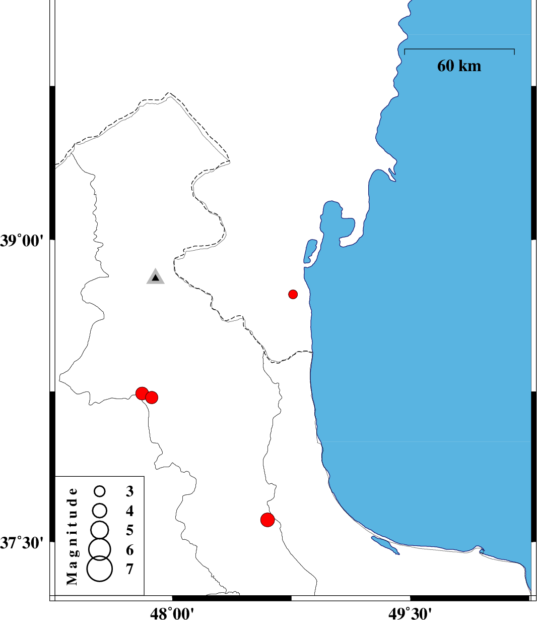 | 2012/01/03 | 00:56:30.8 | 04:26:30.8 | 38.24 | 47.81 | 14 | ML:3.6 | Ardebil Province, 22 km South-East of Meshgin Shahr |