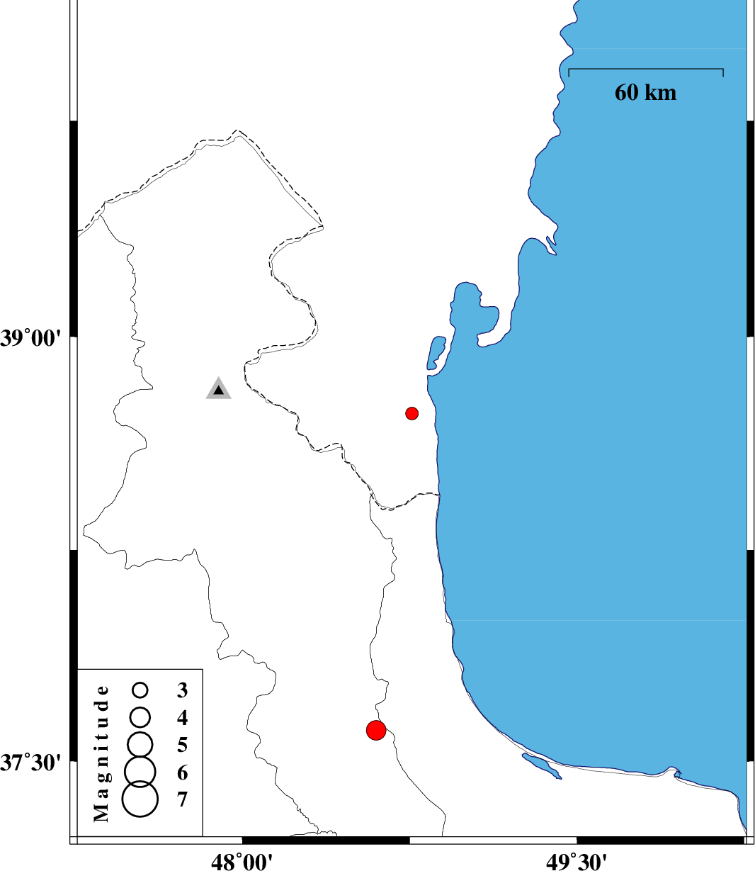 | 2012/01/17 | 00:05:57.4 | 03:35:57.4 | 38.73 | 48.76 | 14 | ML:2.6 | Azerbaijan, 35 km North of Astara | ||