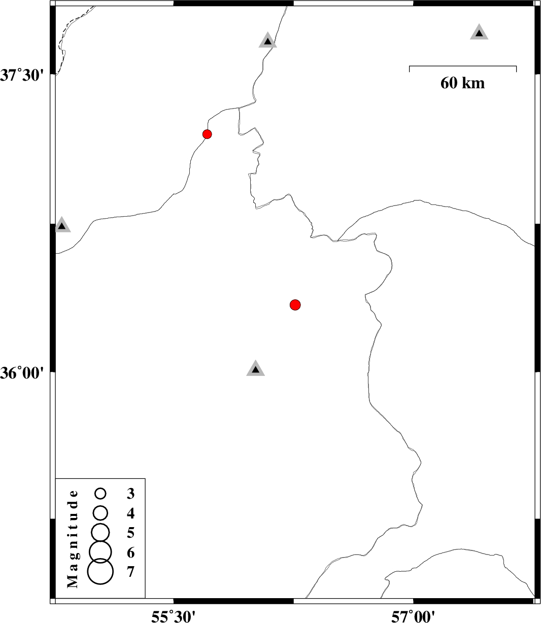 | 2012/01/17 | 09:22:17.8 | 12:52:17.8 | 36.34 | 56.26 | 16 | ML:2.9 | Semnan Province, 69 km South-West of Jajarm | ||