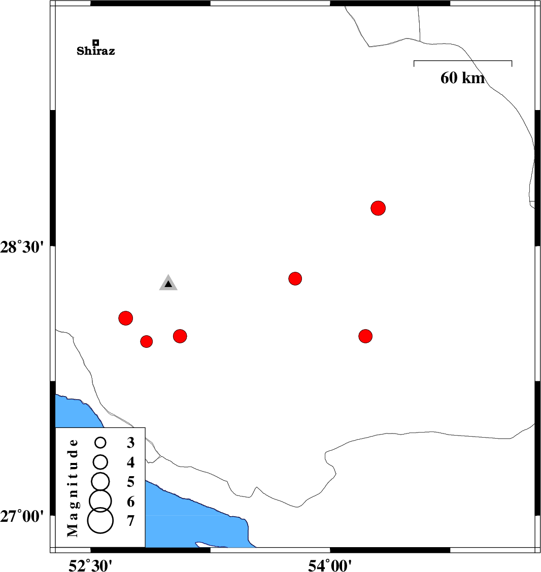 | 2012/01/08 | 06:16:04.0 | 09:46:04.0 | 27.97 | 52.85 | 14 | ML:3.4 | Fars Province, 47 km North of Mehr | ||