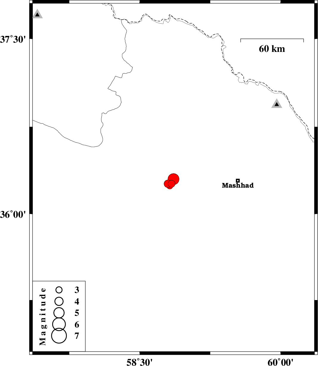 | 2012/01/19 | 12:35:51.2 | 16:05:51.2 | 36.3 | 58.86 | 16 | ML:5.4 | Khorasan(center) Province, 12 km Neyshabur | ||