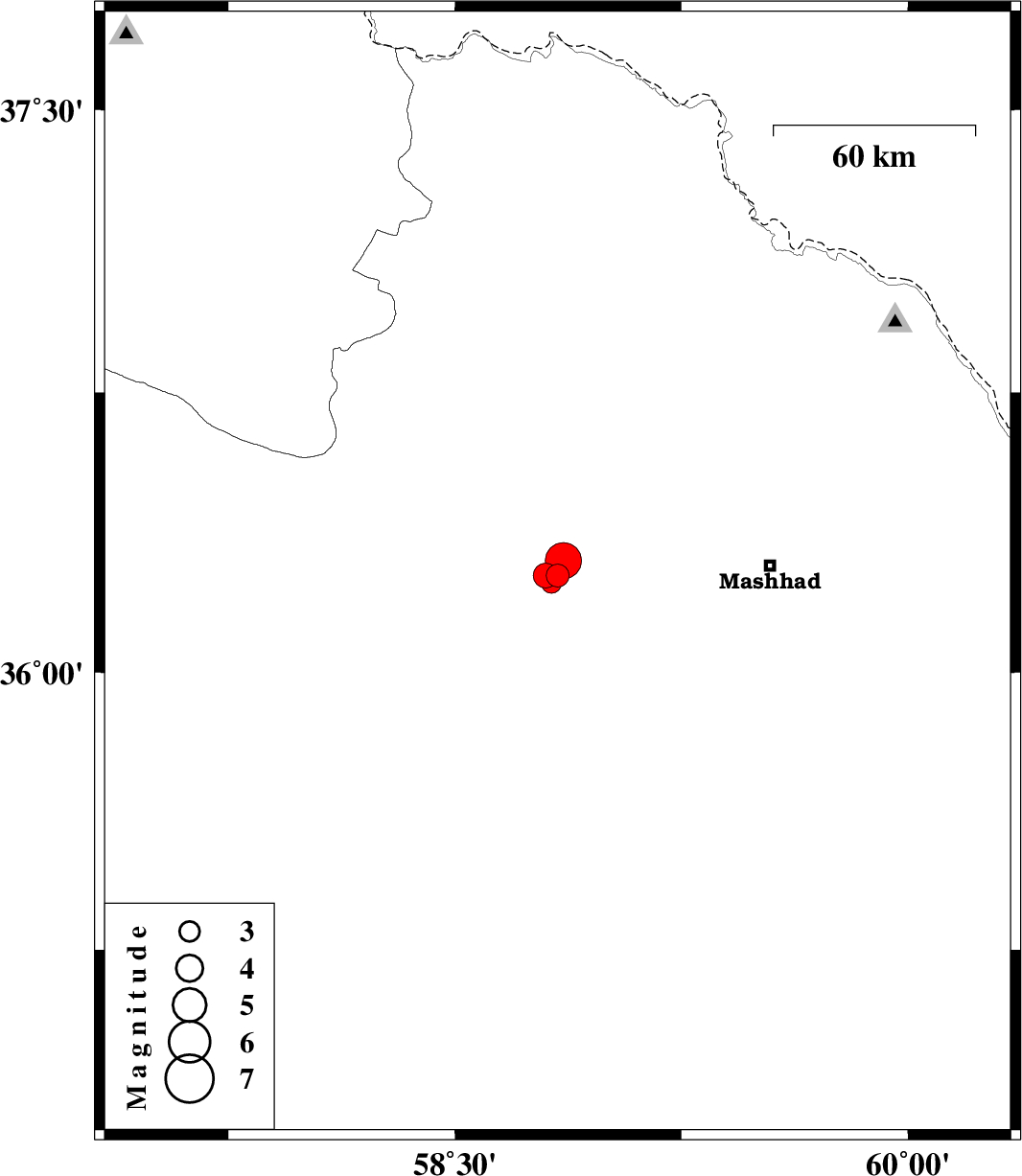 | 2012/01/19 | 12:35:51.2 | 16:05:51.2 | 36.3 | 58.86 | 16 | ML:5.4 | Khorasan(center) Province, 12 km Neyshabur | ||