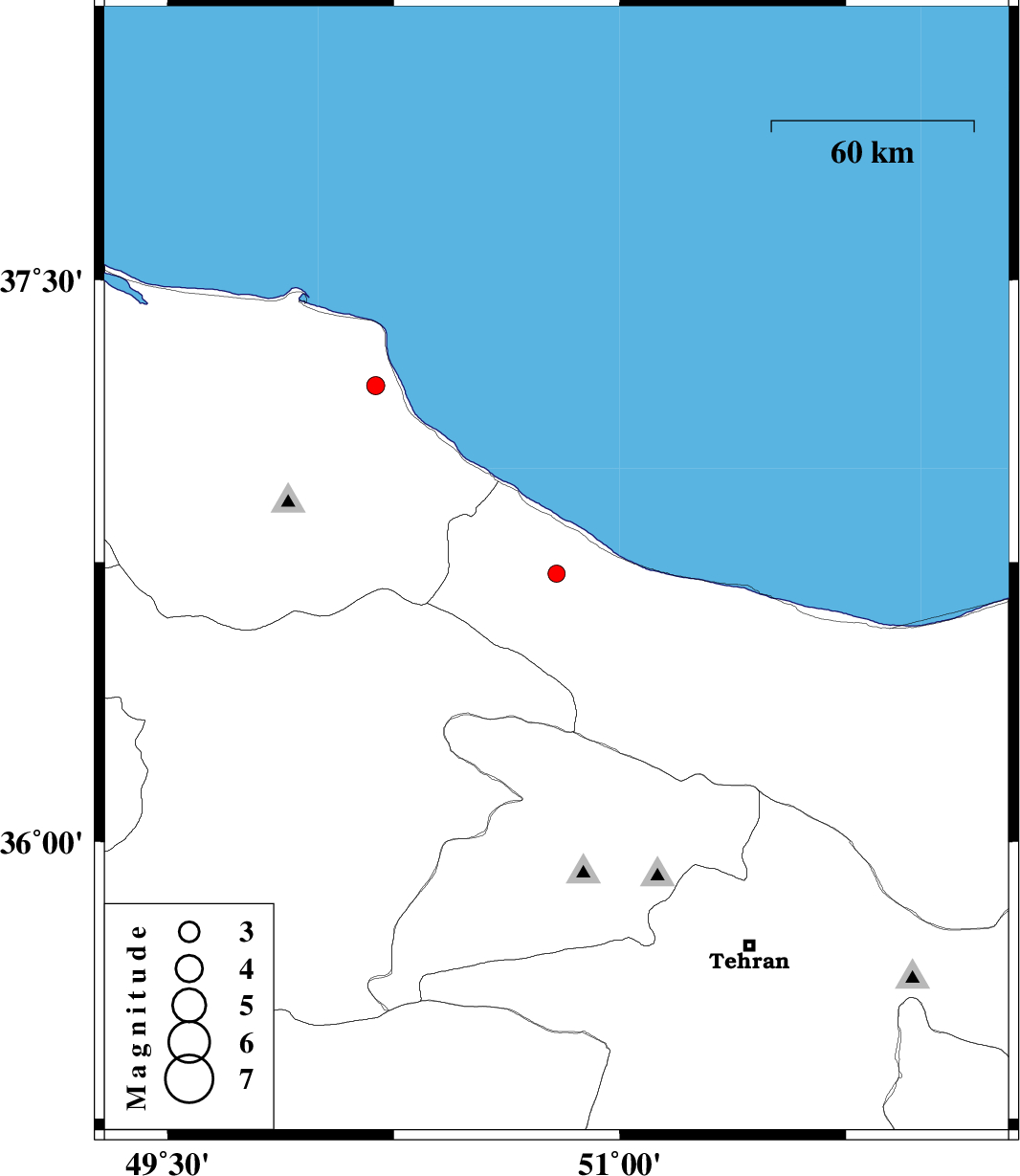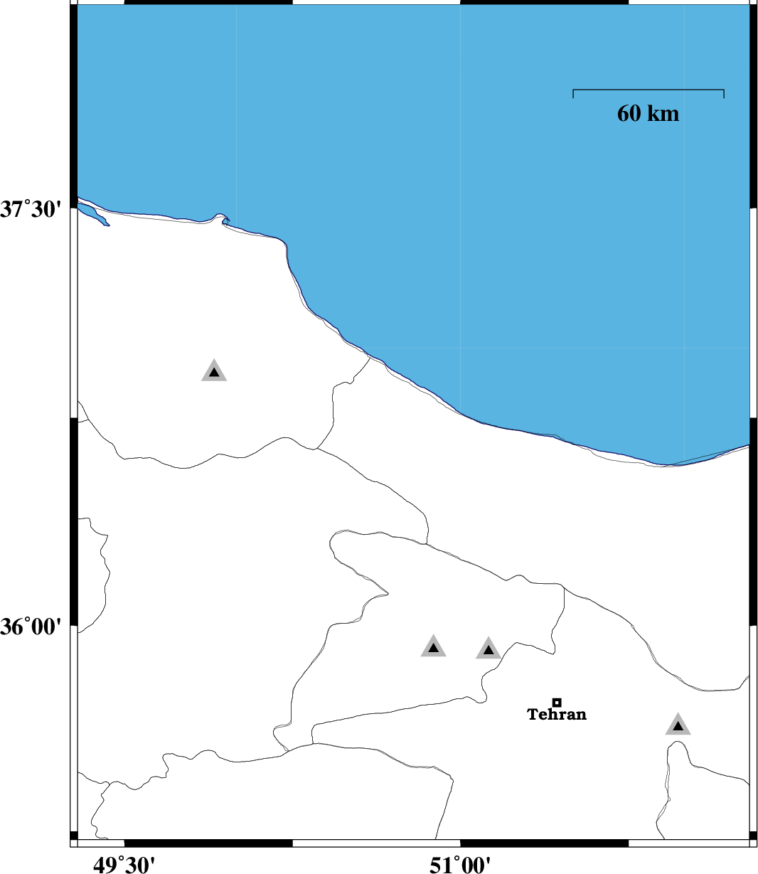 | 2012/01/21 | 06:27:11.4 | 09:57:11.4 | 36.72 | 50.79 | 14 | ML:2.6 | Mazandaran Province, 13 km Tonekabon | ||