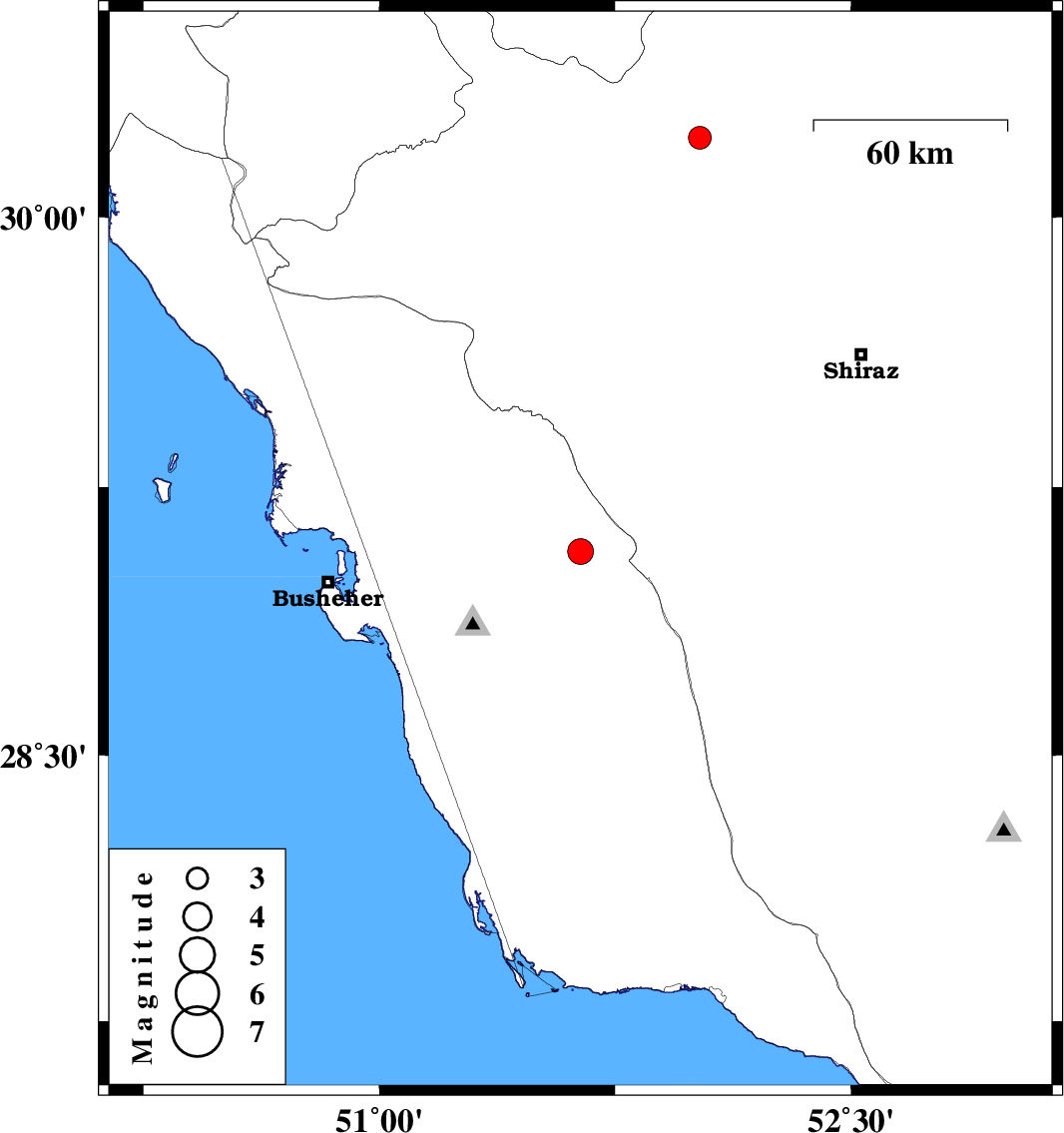 | 2012/01/22 | 03:22:20.2 | 06:52:20.2 | 29.07 | 51.64 | 29 | ML:3.7 | Bushehr Province, 61 km South of Kazerun | ||